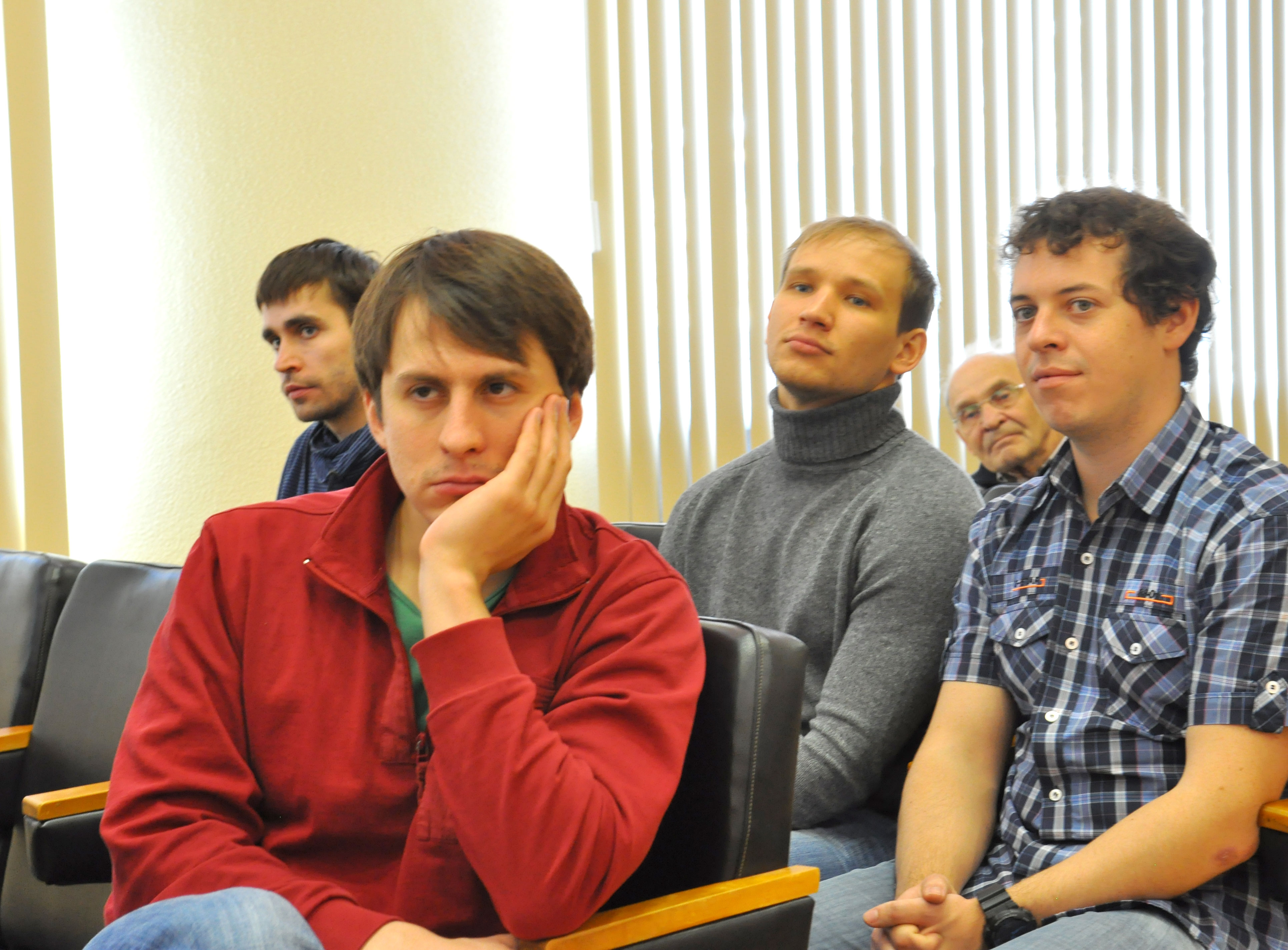 2015 год, май. На заседании ученого Совета Института физики им. Л.В. Киренского Сибирского отделения Российской академии наук. В первом ряду М.С. Платунов, старший научный сотрудник лаборатории физики магнитных явлений. Во втором ряду (слева направо): И.А. Тарасов, научный сотрудник лаборатории физики магнитных явлений, С.В. Аксенов, старший научный сотрудник лаборатории теоретической физики и Максим Шустов. Красноярск.