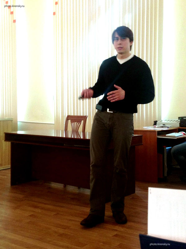 Платунов Михаил Сергеевич, кандидат физико-математических наук, старший научный сотрудник лаборатории физики магнитных явлений Института физики им Л.В. Киренского Сибирского отделения Российской академии наук. Доклад на семинаре в конференц-зале Института физики. Фото 2013 года.