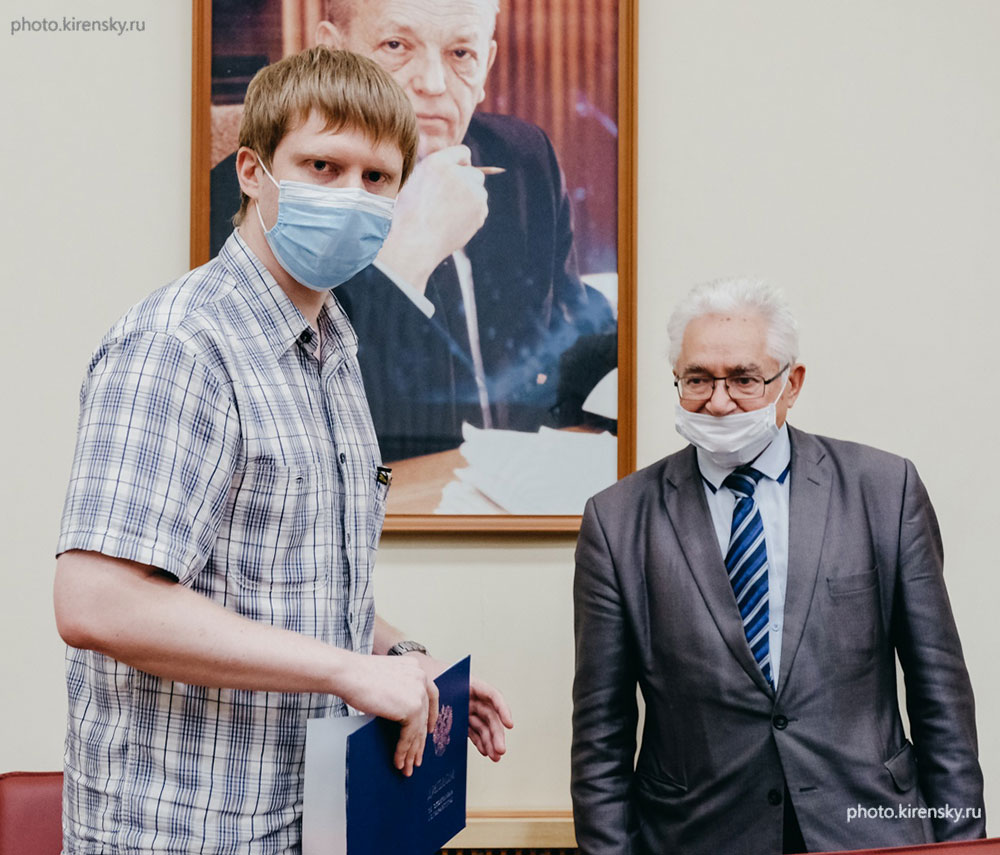 Полукеев Семён Игоревич (слева), младший научный сотрудник лаборатории физики магнитных явлений Института физики им. Л.В. Киренского Сибирского отделения Российской академии наук, получает диплом об окончании аспирантуры. Вручает диплом академик Шабанов Василий Филиппович. 2020 год