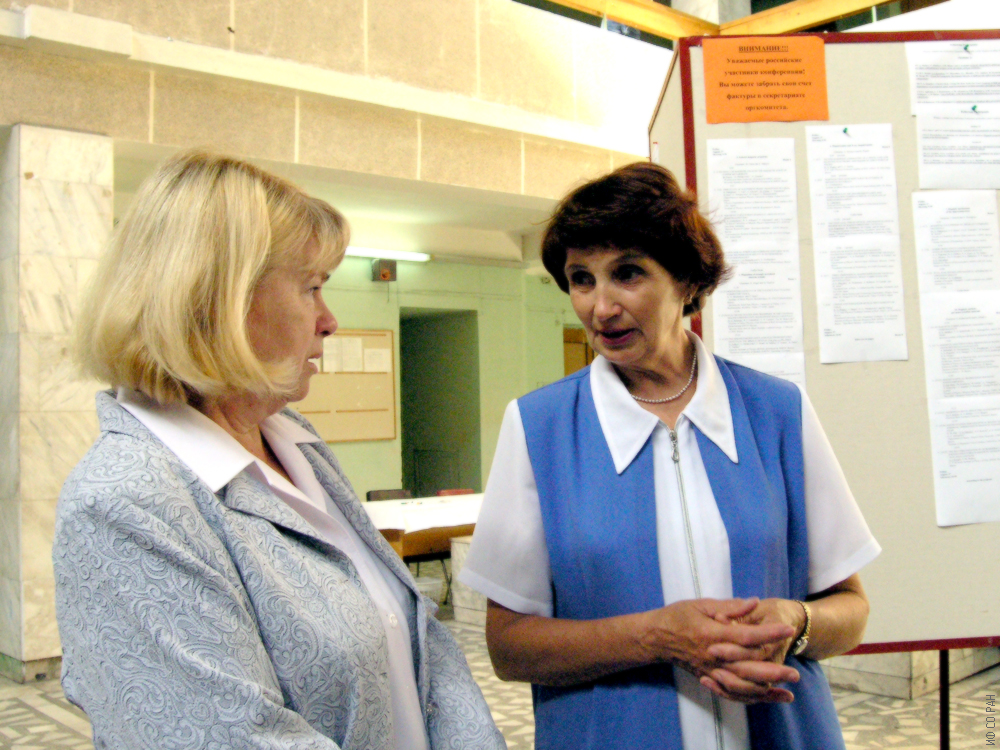 Клавдия Павловна Полякова (слева), Анна Яковлевна Бетенькова, сотрудники Института физики им. Л.В. Киренского Сибирского отделения Российской академии наук (ИФ СО РАН), на Евро-Азиатском симпозиуме «Прогресс в магнетизме» (ЕASTMAG-2004), Красноярск, август 2004 года.