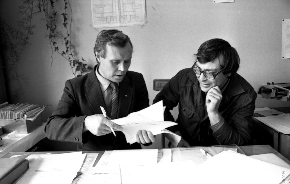 Хрусталев Борис Петрович (слева), заведующий лабораторией сильных магнитных полей Института физики им. Л.В. Киренского Сибирского отделения Российской академии наук (ИФ СО РАН) и Поздняков Валерий Григорьевич, младший научный сотрудник лаборатории, за обсуждением результатов эксперимента, фото 1990 года. Красноярск.