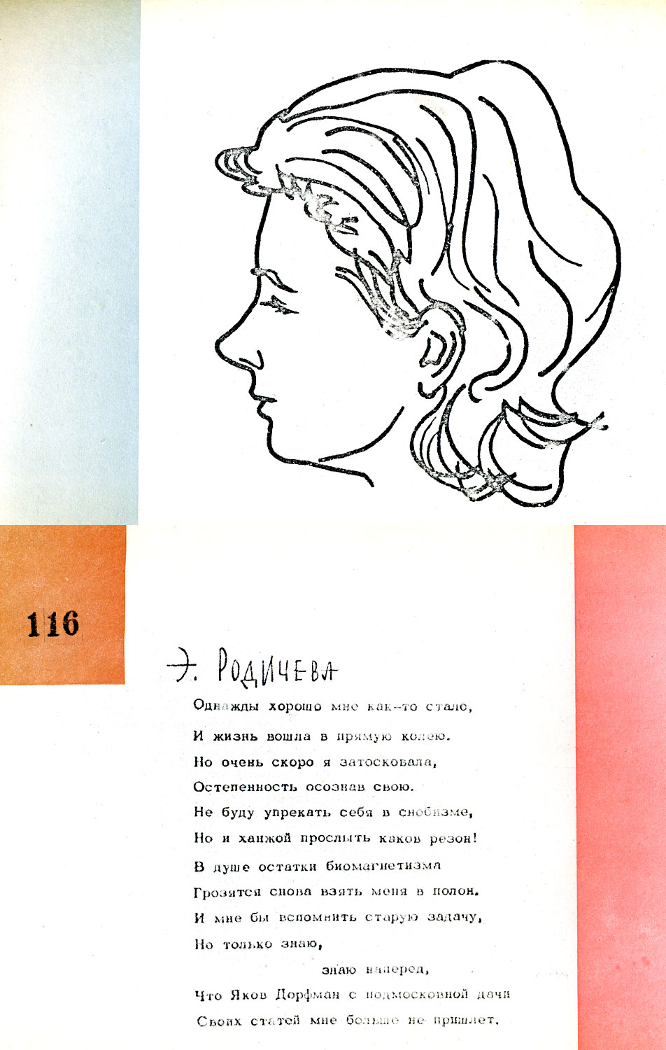 Дружеский шарж Родичевой Э.К. из книги "Музей друзей", изданной научными сотрудниками Института физики Сибирского отделения Академии наук СССР (ИФ СО АН СССР) Олегом Артемьевичем Баюковым и Николаем Сергеевичем Чистяковым. Удивительная книжка дружеских шаржей и эпиграмм на сотрудников Института физики СО АН СССР. Она вышла в 1967 году к 10-летию начала работы института. Вышла небольшим тиражом в 100 экземпляров и распространялась строго по списку, лично в руки. Узнать себя на страницах книги смогли 48 самых ярких и заметных личностей молодого института. Позже (в 1971 году) вышла вторая книга под таким же названием. Что побудило их взяться за такой труд, авторы подробно изложили в предисловии к первой и второй книгам. Книги размещены на сайте.
