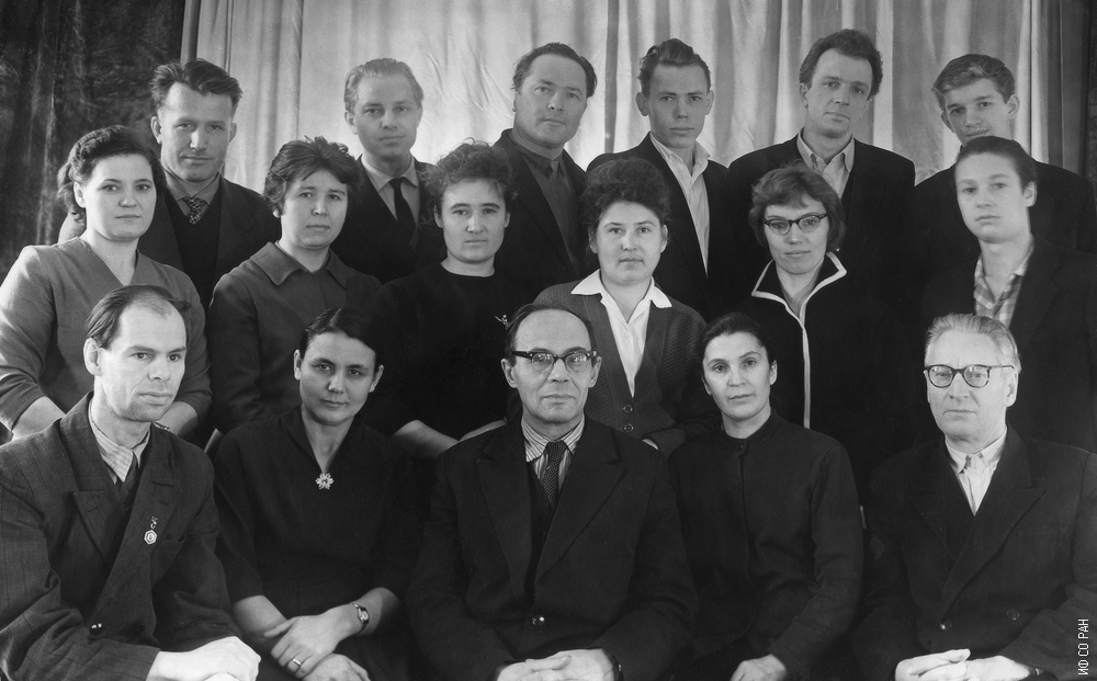Сотрудники лаборатории молекулярной спектроскопии Института физики Сибирского отделения Академии наук СССР (ИФ СО АН СССР), организованной в 1959 году. В первом ряду сидят (слева направо): А.Л. Юдин, В.Г. Юдина, А.В. Коршунов, М.В. Рябцева, А.А. Коловский. Во втором ряду (слева направо): М.В. Лысяк, Р.И. Подгаецкая, Л.Г. Сидорова, Г.А. Зуйкова, Л.Н. Звегинцева ?. В третьем ряду (слева направо): Д.И.Алешин, А.Ф. Бондарев, Л.С. Соловьев, Ю.С. Русецкий, В.В. Кинд, ? . Фото 1961 года. Красноярск.