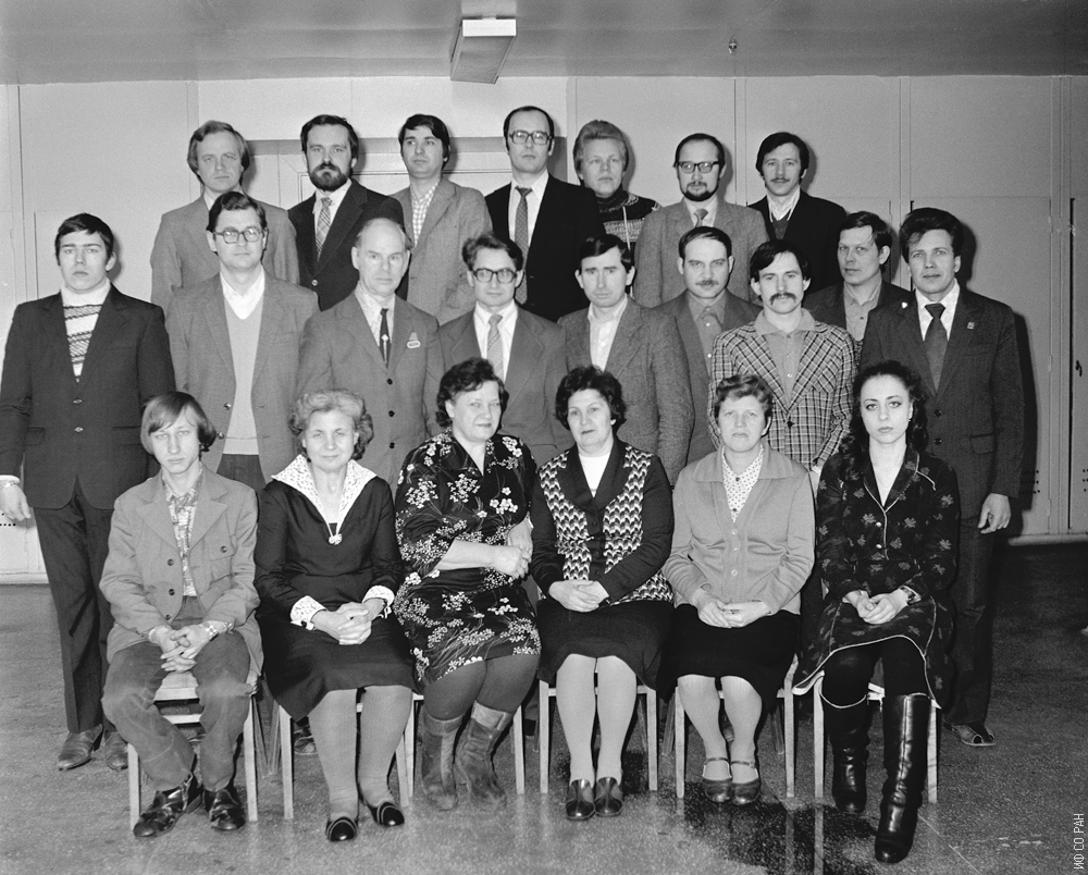 Сотрудники лаборатории молекулярной спектроскопии Института физики им. Л.В. Киренского Сибирского отделения Академии наук СССР (СО АН СССР с 1991 года - СО РАН). В первом ряду сидят (слева направо): Фроленко В.А., Юдина В.Г., Лысяк М.В., Рябцева М.В., Аксенова Г. С., Позднякова Т. А. Во втором ряду (слева направо): ?, Аверьянов Е.М., Юдин А.Л., Шабанов В.Ф., Федотов А.П., Зайцев Н.К., Шестаков Н.П., Кабанов И.С., Ермаков В.П. В третьем ряду (слева направо): Шкуряев П.Г., Жуйков В.А., Корбан Н.П., Корец А.Я., Зырянов В.Я., Ботвич А.Н., Гуняков В.А. Снимок 1982 года. Красноярск.