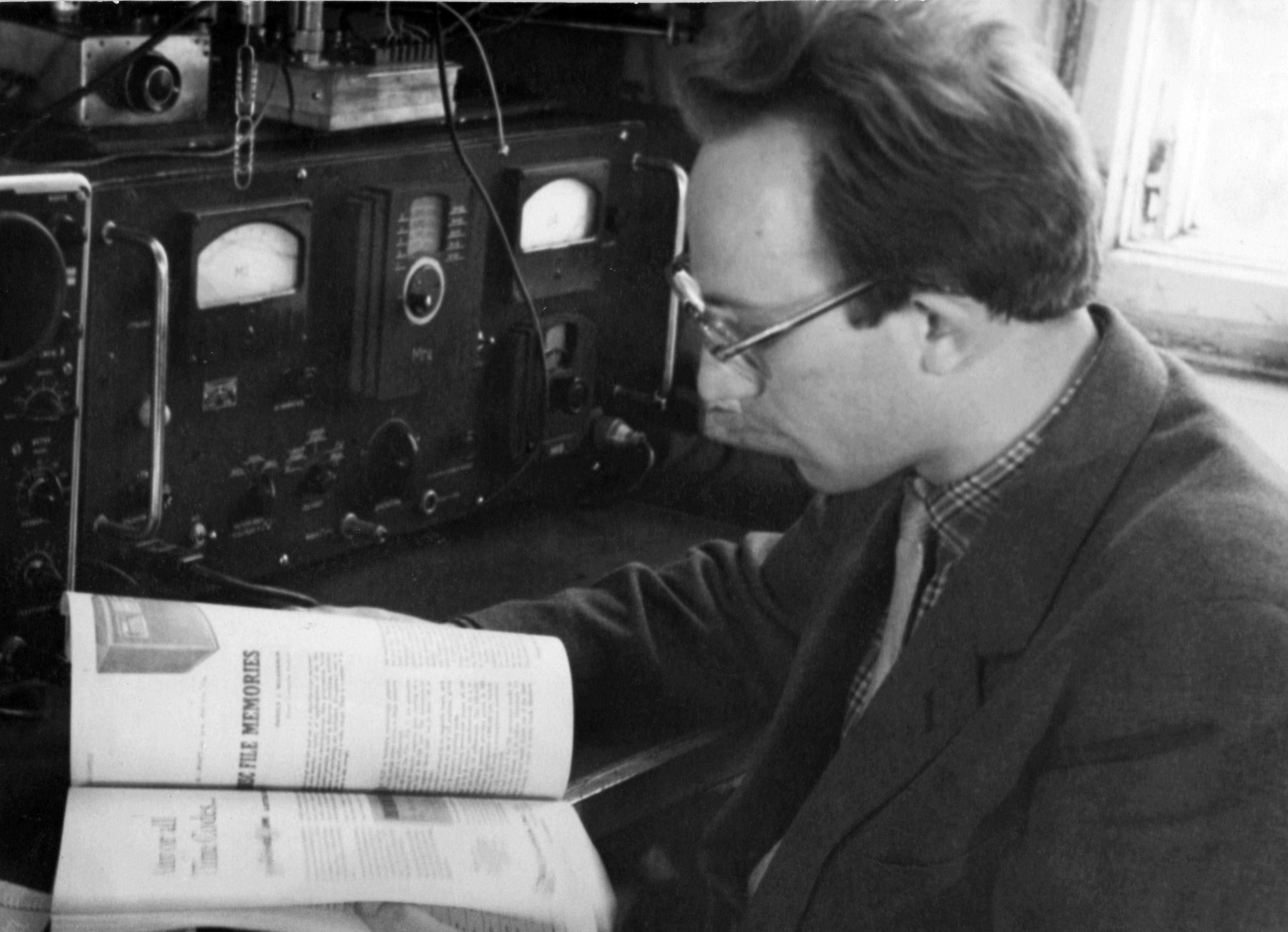 1962 год. Рябинкин Лев Николаевич, сотрудник лаборатории кристаллофизики (до 1964 года) Института физики Сибирского отделения Академии наук СССР (ИФ СО АН СССР), у созданной им уникальной установки для измерения скорости ультразвука в малых кристаллических образцах. В то время точность измерения составляла 0,02 % на образцах размером около 3 мм. Красноярск.