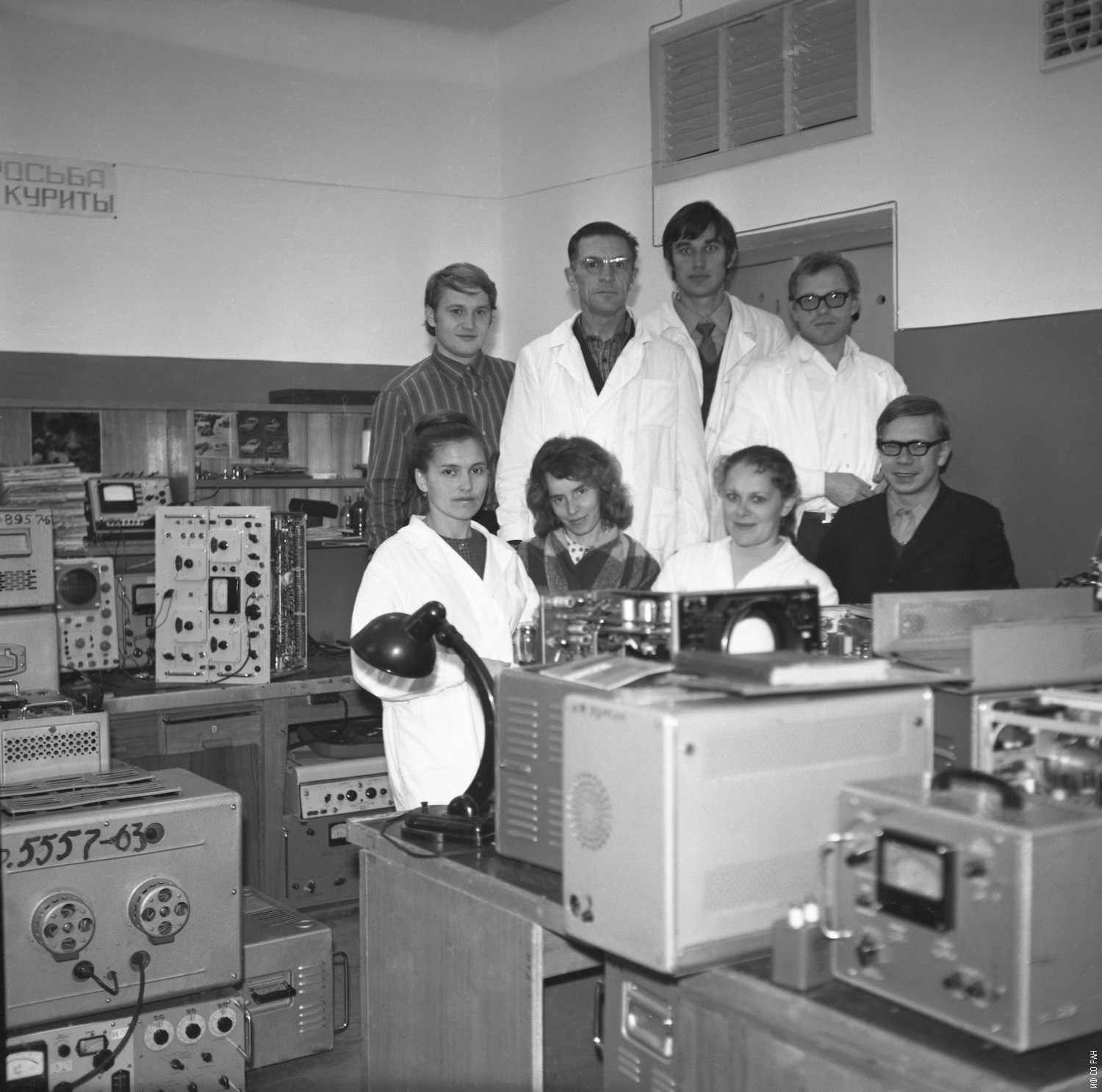 Сотрудники бюро измерительных приборов (БИП) Института физики им. Л.В. Киренского Сибирского отделения Академии наук СССР (ИФ СО АН СССР), сидят, слева направо: Самойлова Л.К., неизвестна, Новошинская В.Д., Якимов А.М. Стоят, слева направо: Коршунов Н.А., Тарсуков В.С., Зобков С.П., Петроченко М.П., фото 1972 года.