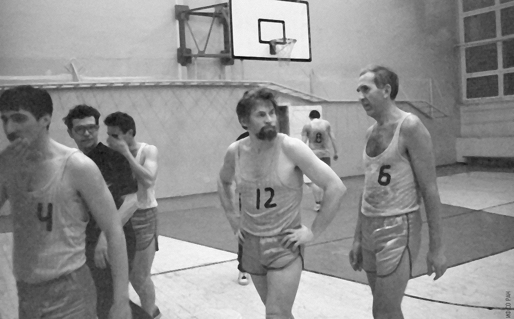 Межлабораторный турнир на первенство Института физики им. Л.В. Киренского Сибирского отделения Академии наук СССР (ИФ СО АН СССР) по баскетболу. На фото, справа - Сандалов Игорь Семенович и Овчинников Сергей Геннадьевич (крайний), 1984 год. Красноярск.