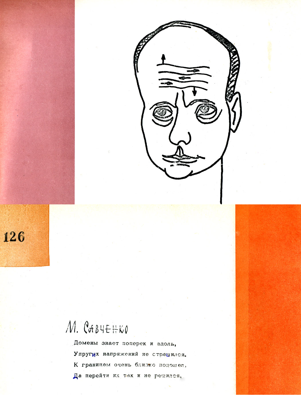 Дружеский шарж Савченко М.К. из книги шаржей и эпиграмм"Музей друзей", первая часть которой вышла в 1967 году. Авторами ее являются научные сотрудники института О.А. Баюков и Н.С. Чистяков. Книга вышла малым тиражом (всего 100 экземпляров) и моментально разошлась среди персонажей книги, сотрудников и была подарком авторов к юбилею института.