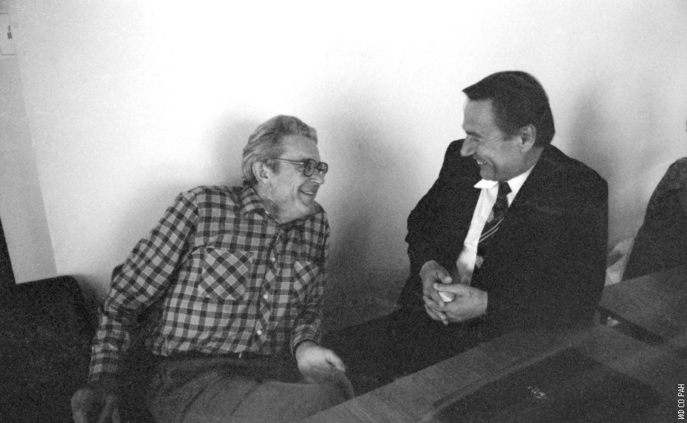 1983 год. В Институт физики им. Л.В. Киренского Сибирского отделения Академии наук СССР (ИФ СО АН СССР) приехал в гости из Крыма бывший сотрудник института Селезнев В.Н. Снимок на память. Анистратов А.Т. (справа), старший научный сотрудник лаборатории кристаллофизики института, и Селезнев В.Н. Красноярск.