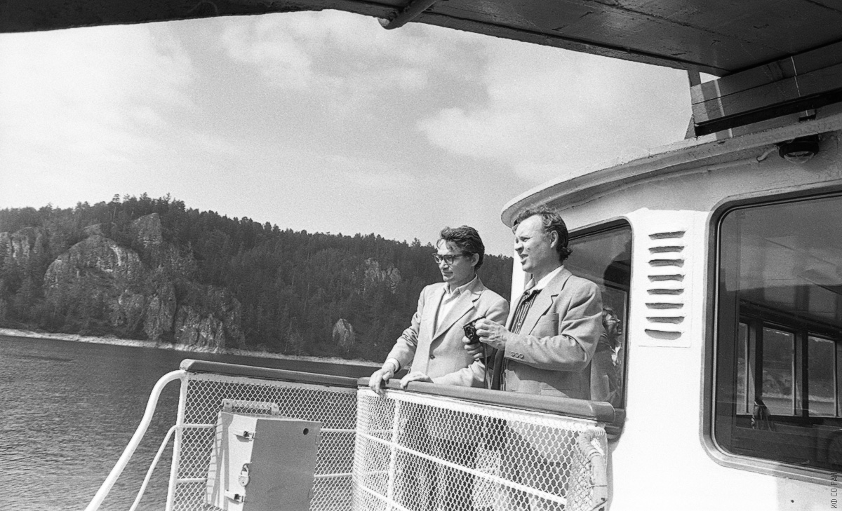 Шабанов В.Ф., директор Специального конструкторско - технологического бюро "Наука" Красноярского научного центра (слева) и Хрусталев Б.П., заместитель директора по научной работе Института физики, участники второго семинара «Резонансные, нелинейные, оптические процессы в газах», организованного и проведенного Институтом физики им. Л.В. Киренского Сибирского отделения Академии наук СССР в 1986 году в Дивногорске (город на Енисее под Красноярском). Рейсовый теплоход Красноярск - Дивногорск.