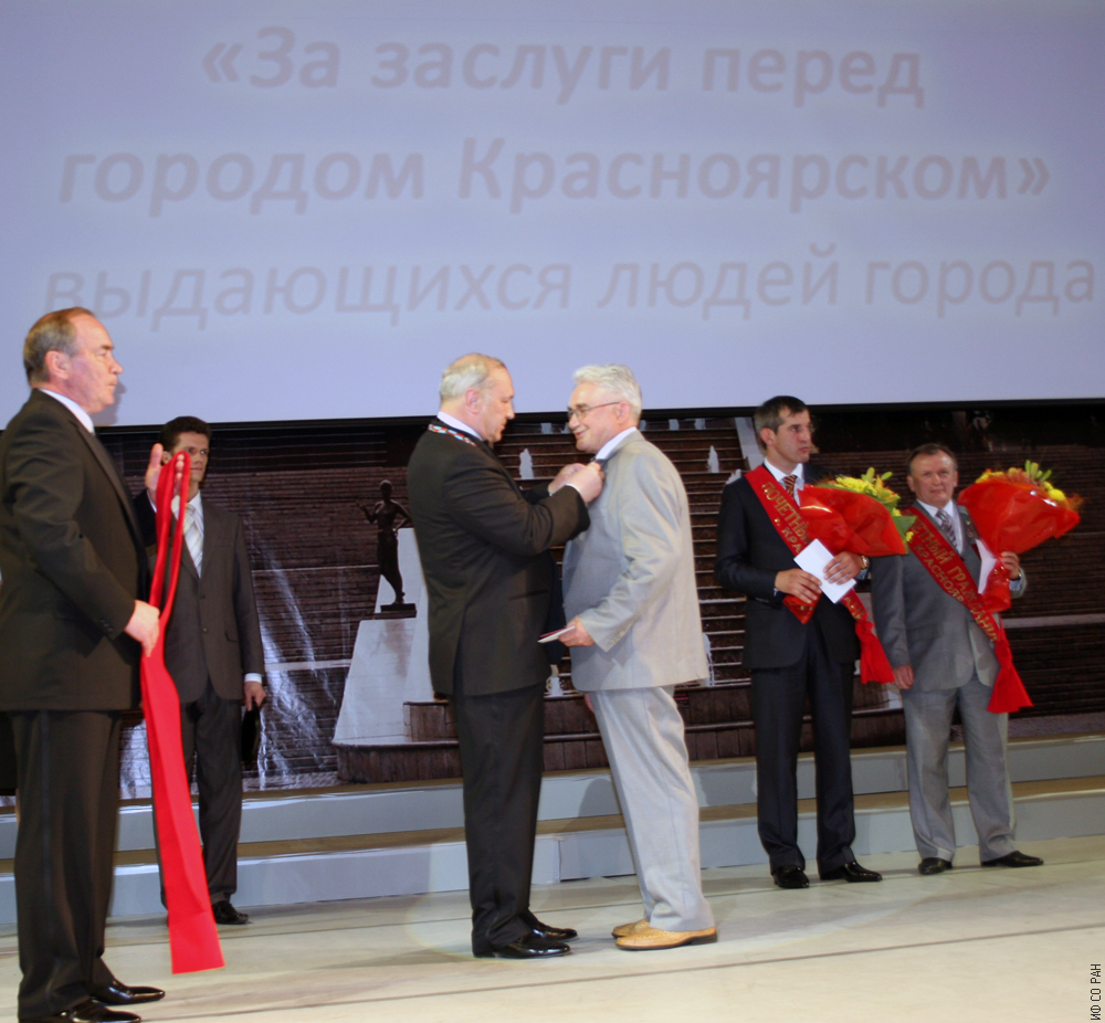 Мэр города Красноярска Пимашков Петр Иванович вручает отличительный знак почетного гражданина Красноярска академику Шабанову Василию Филипповичу, председателю Президиума Красноярского научного центра Сибирского отделения Российской академии наук (КНЦ СО РАН) и директору Института физики им. Л.В. Киренского Сибирского отделения Российской академии наук (КНЦ СО АН СССР). Май 2010 года.