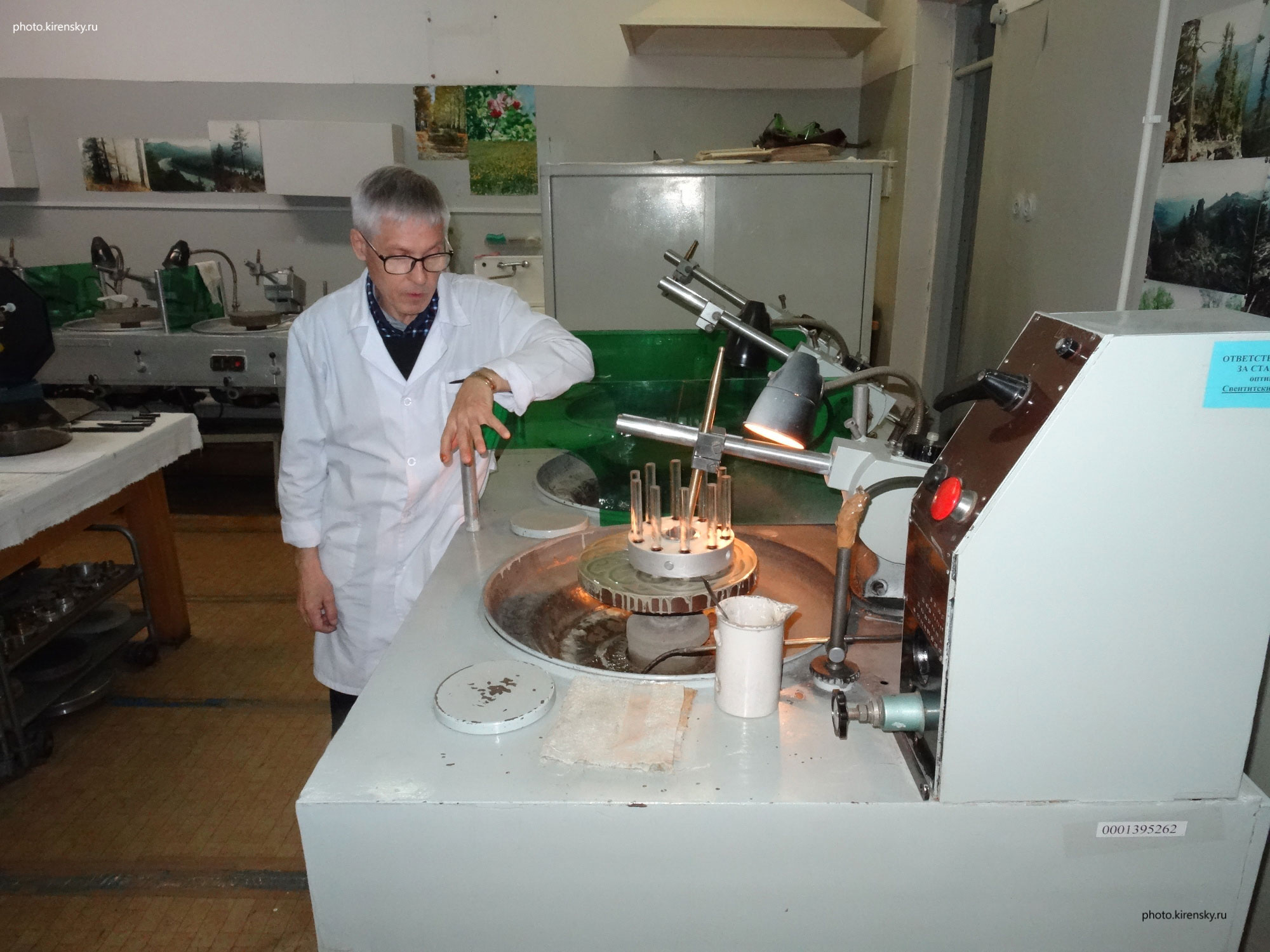 2019 год. Свентитский Владимир Михайлович, сотрудник Института физики им. Л.В. Киренского Сибирского отделения Российской академии наук ( ИФ СО РАН), занят полировкой оптических стекол, предназначенных для использования в экспериментальной лазерной установке лаборатории Научного приборостроения.