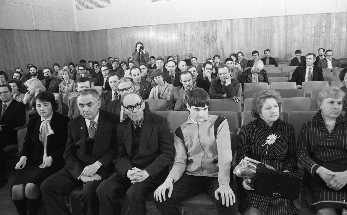 7 апреля 1984 года. Научные чтения, посвященные памяти академика Л.В. Киренского, организатора и первого директора Института физики Сибирского отделения Академии наук СССР (ИФ СО АН СССР) с участием научной общественности институтов Красноярского научного центра. В первом ряду слева направо: Т.Г. Волова – институт биофизики СО АН СССР, академик И.А.Терсков – директор Института биофизики СО АН СССР, А.В.Коршунов - заведующий отделом спектроскопии Института физики СО АН СССР, внук Л.В. Киренского, дочь Татьяна Леонидовна Овчинникова, М.М.Калинина. Красноярск.