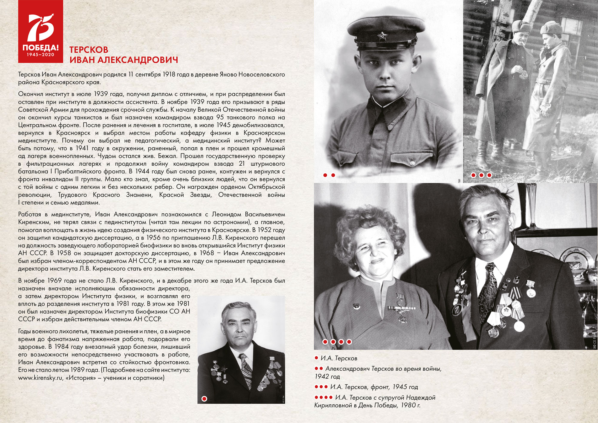 Терсков Иван Александрович, (1918-1989), окончил Красноярский государственный педагогический институт в 1939 году, специалист в области биофизики, работал в Институте физики им. Л.В. Киренского Сибирского отделения Академии наук СССР с 1956 по 1981 год, защитил диссертацию на соискание ученой степени кандидата физико-математических наук в 1952, диссертацию на соискание степени доктора биологических наук " Спектрофотометрическое исследование крупнодисперсных окрашенных частиц биологического происхождения" в 1958 году, заведовал лабораторией биофизики с 1957 по 1981 год, с 1967 по 1981 год лабораторией и отделом биофизики, избран член-корреспондентом Академии наук СССР в 1968, действительным членом Академии наук СССР в 1981 году. Директор Института физики с 1969 по1981 год. В 1981 году возглавил открывшийся в Красноярске Институт биофизики Сибирского отделения Академии наук СССР. Более подробная информация на сайте Института физики СО РАН.
