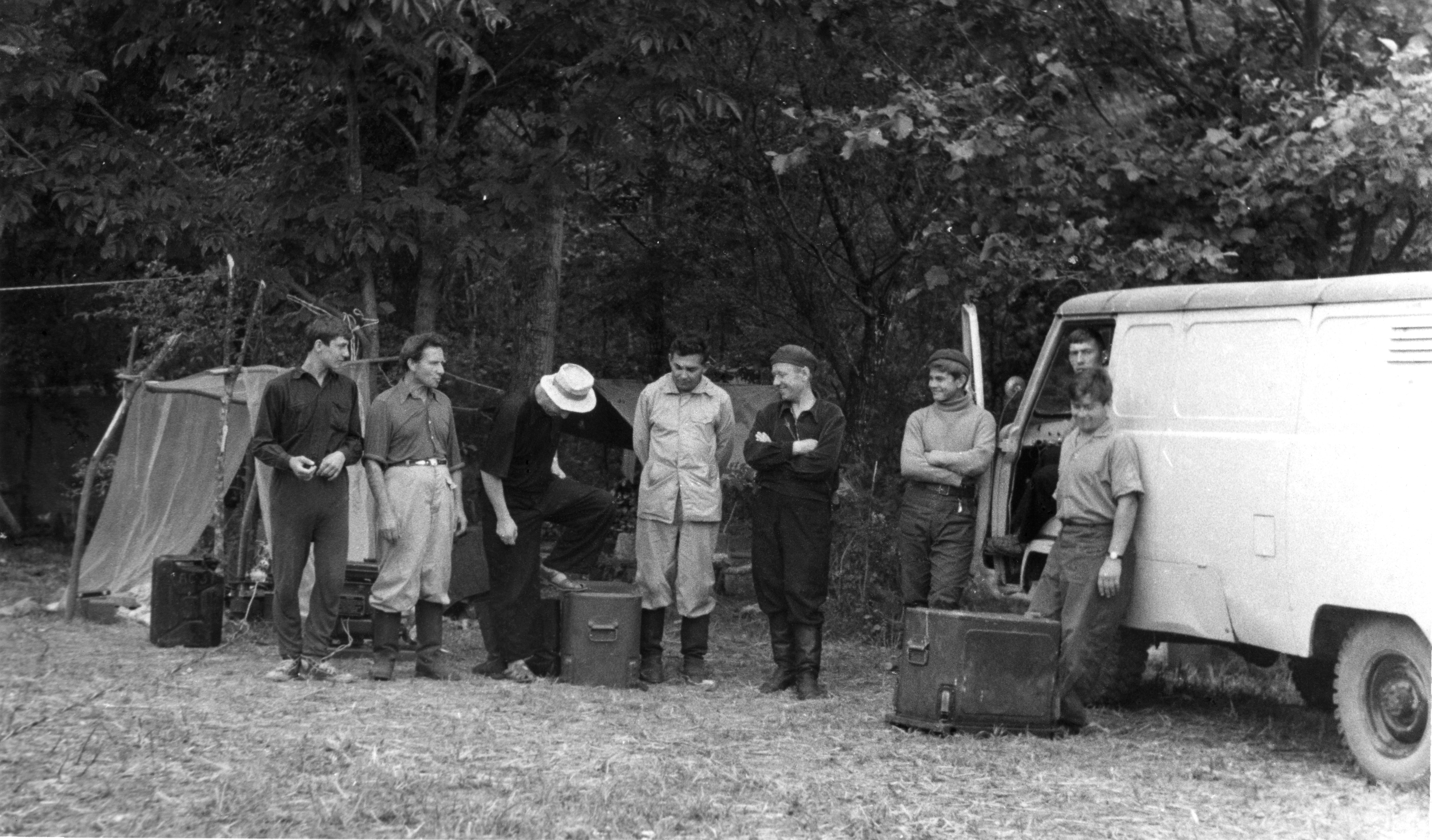 Члены очередной научной экспедиции на Дальний Восток в Уссурийскую тайгу для проведения полевых испытаний ультрафиолетовых ловушек, использующихся для собирания насекомых-вредителей леса. Ловушки были разработаны и изготовлены в отделе биофизики Института физики Сибирского отделения Академии наук СССР. На фото в центре И.А. Терсков, заведующий отделом биофизики института и руководитель экспедиции. 1964 год.