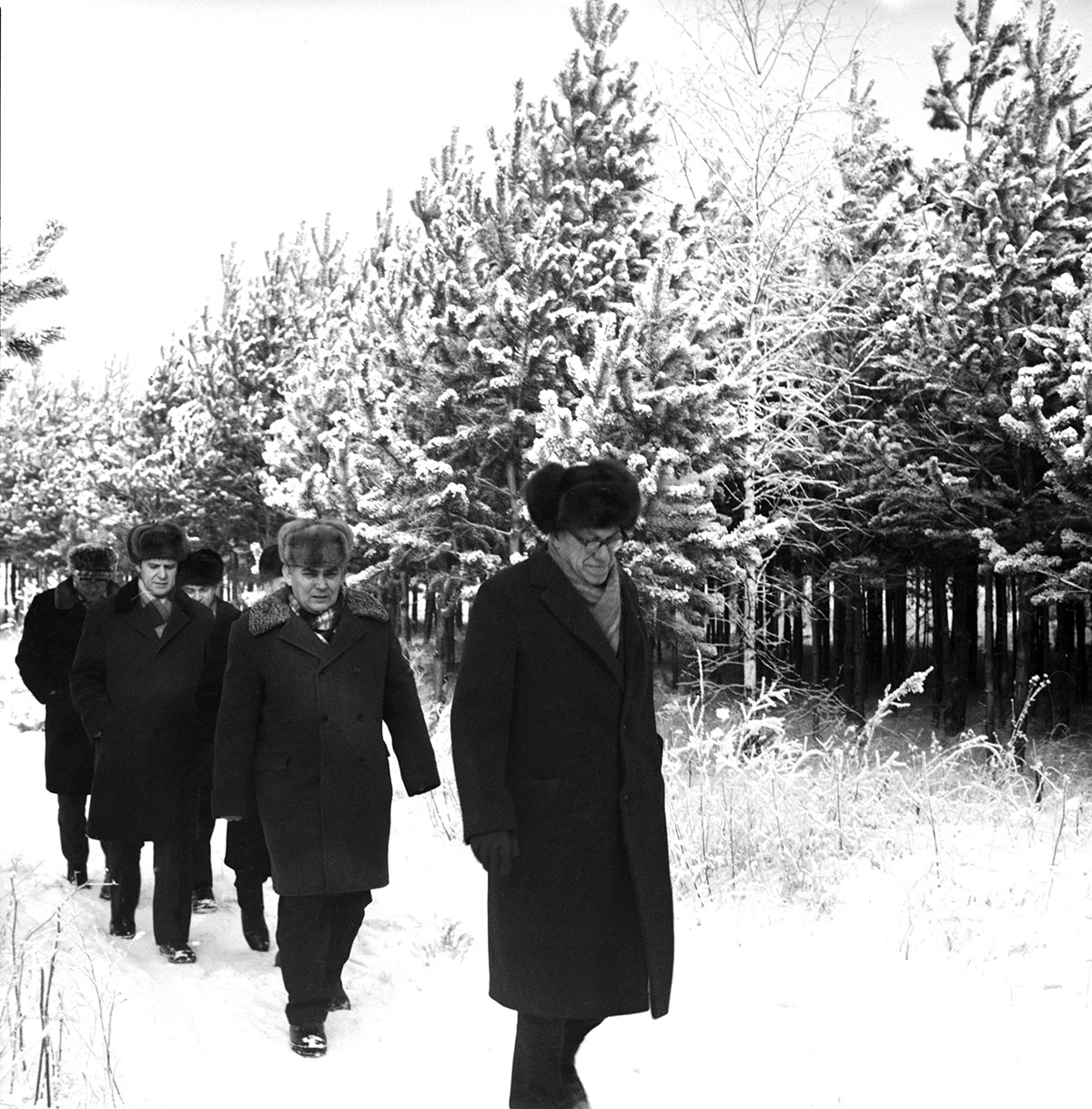 1980 год. Во время визита председателя Президиума Сибирского отделения Академии наук СССР академика М.А. Лаврентьева в Красноярск. В Красноярском Академгородке. Первым идет М.А. Лаврентьев, затем И.А. Терсков, директор Института физики им. Л.В. Киренского Сибирского отделения Академии наук СССР (ИФ СО АН СССР), А.С. Исаев, председатель Красноярского филиала Сибирского отделения Академии наук СССР (КФ СО АН СССР).