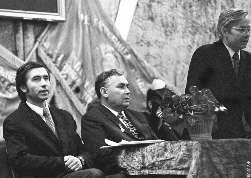 В конференц-зале Института физики им. Л.В. Киренского Сибирского отделения Академии наук СССР. В президиуме торжественного заседания, посвященного годовщине Октябрьской революции 1917 года, слева направо: Эдуард Михайлович Смокотин, ученый секретарь; Иван Александрович Терсков, директор института; Федор Яковлевич Сидько, председатель профсоюзного комитета института, 5 ноября 1980 года. Красноярск.
