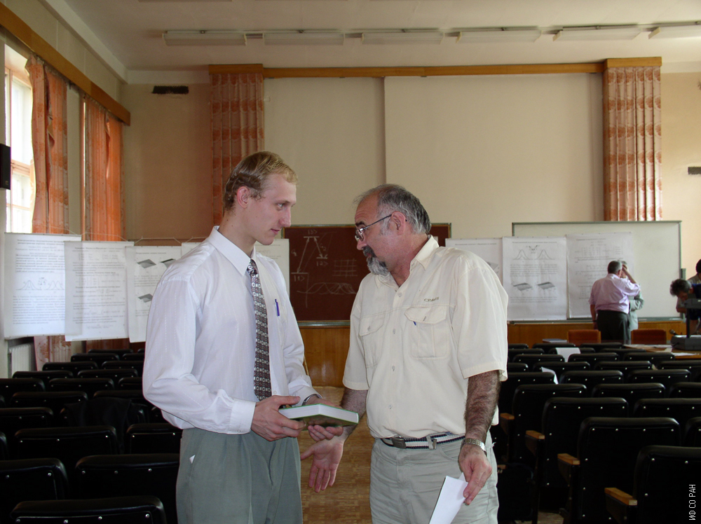 Иван Владимирович Тимофеев, старший научный сотрудник (слева) и Василий Григорьевич Архипкин, заведующий лабораторией когерентной оптики Института физики им. Л.В. Киренского Сибирского отделения Российской академии наук, после защиты Тимофеевым диссертации на соискание ученой степени кандидата физико-математических наук. Июнь 2003 года. Красноярск.