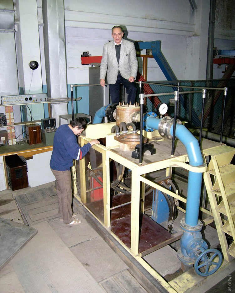Петров Михаил Иванович (на установке), заведующий лабораторией сильных магнитных полей Института физики им. Л.В. Киренского Сибирского отделения Российской академии наук (ИФ СО РАН) и Томулевч Юрий Викторович, инженер лаборатории, у диссипативного соленоида на 20 Т, разработанного и собранного в лаборатории. Фото 1996 года. Красноярск.