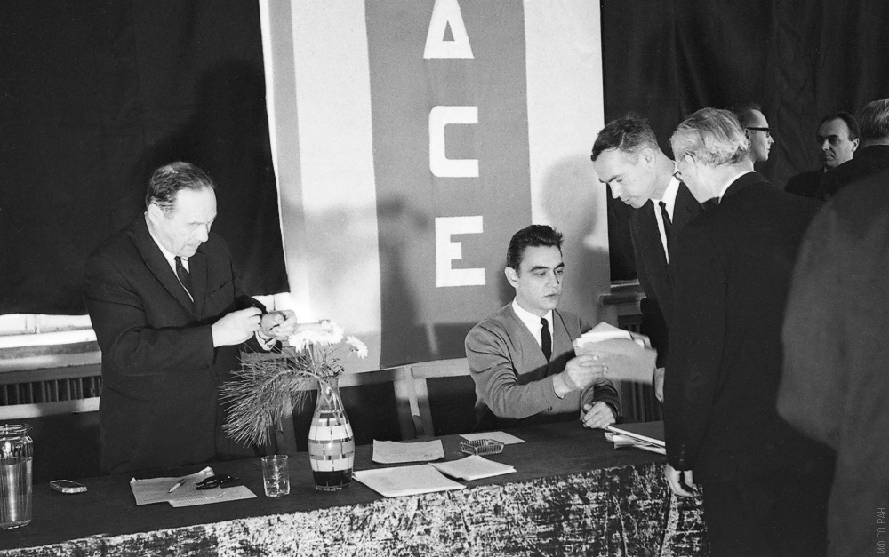 1969 год. На заседании диссертационного совета Института физики Сибирского отделения Академии наук СССР идет голосование. Слева направо: Киренский Л. В., Тропин Ю. Д., Золотухин Г. Е. Красноярск.
