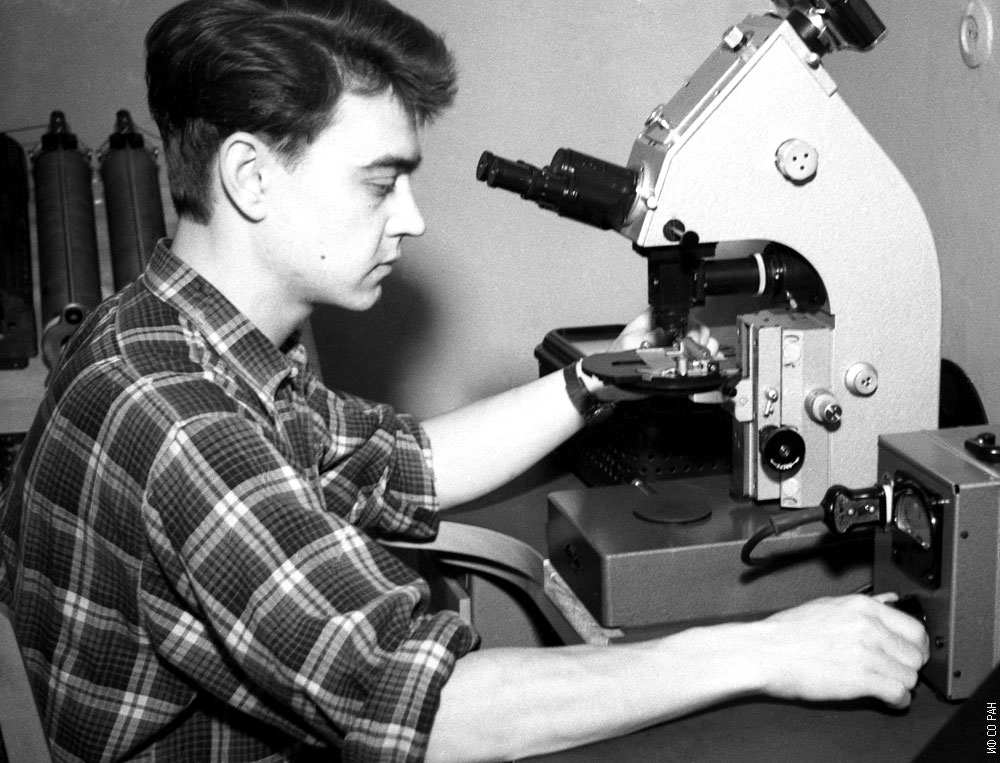 1965 год.Тропин Юрий Дмитриевич, старший научный сотрудник лаборатории магнетизма горных пород и геофизики Института физики Сибирского отделения Академии наук СССР. Занимался исследованием закономерностей, связанных с вязким намагничиванием горных пород. В этом году он защитил диссертацию на соискание ученой степени кандидата физико-математических наук. Красноярск.