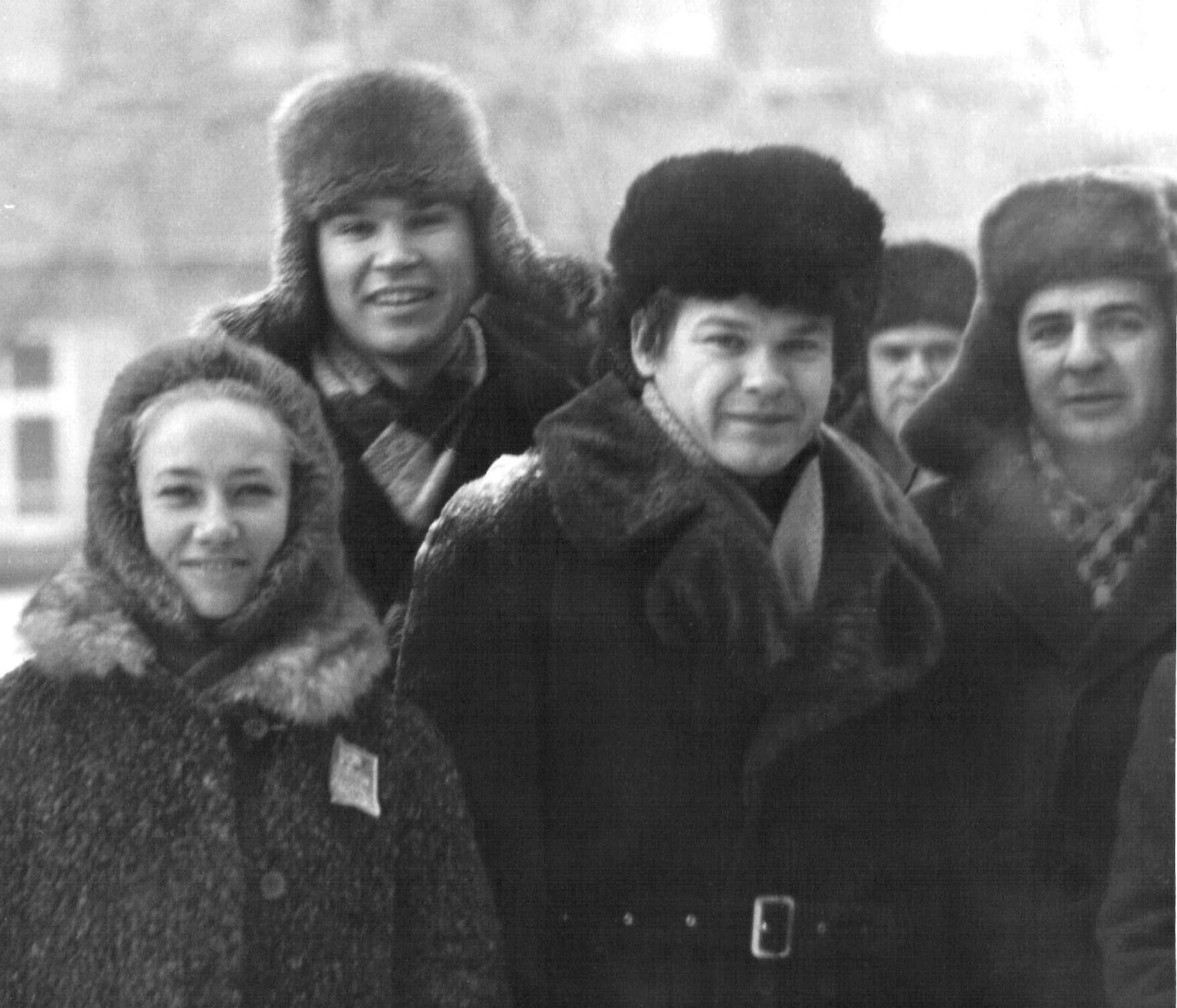 7 ноября 1976 года. Сотрудники лаборатории высокочастотных и импульсных свойств тонких магнитных пленок Института физики им. Л.В. Киренского Сибирского отделения Академии наук СССР (ИФ СО АН СССР) на демонстрации трудящися Красноярска, посвященной Октябрьской революции 1917 года. Слева направо: ?, Тюрнев В.В., Лексиков А.А., Ерухимов М.Ш. Красноярск
