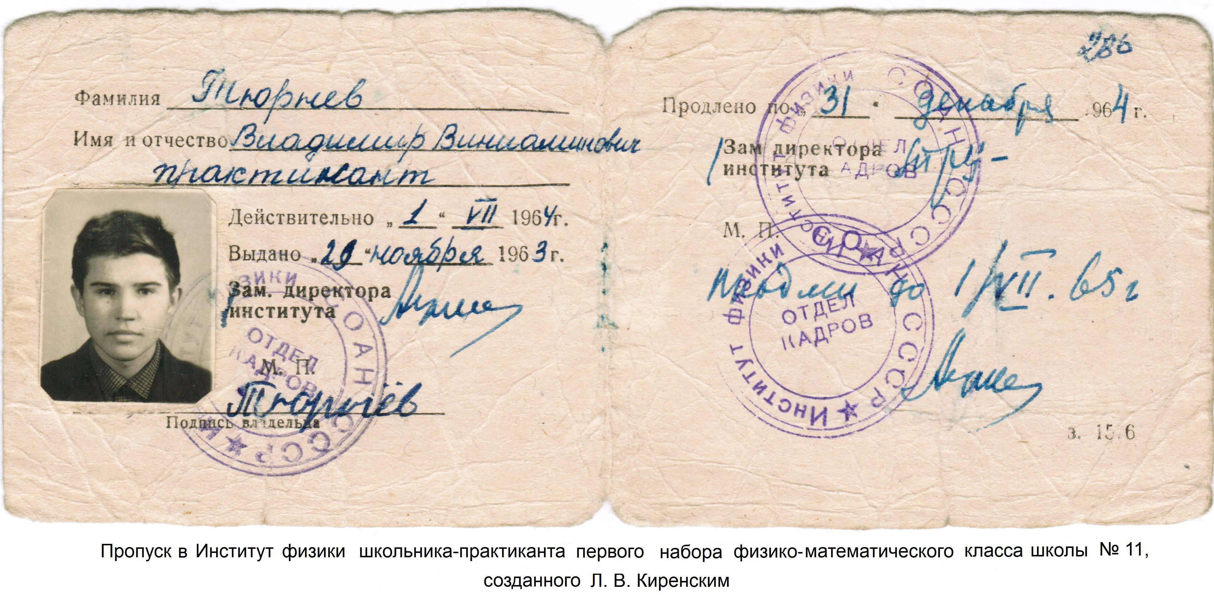Пропуск в Институт физики школьника-практиканта первого набора физико-математического класса школы № 11 г. Красноярска, созданного Л.В. Киренским.