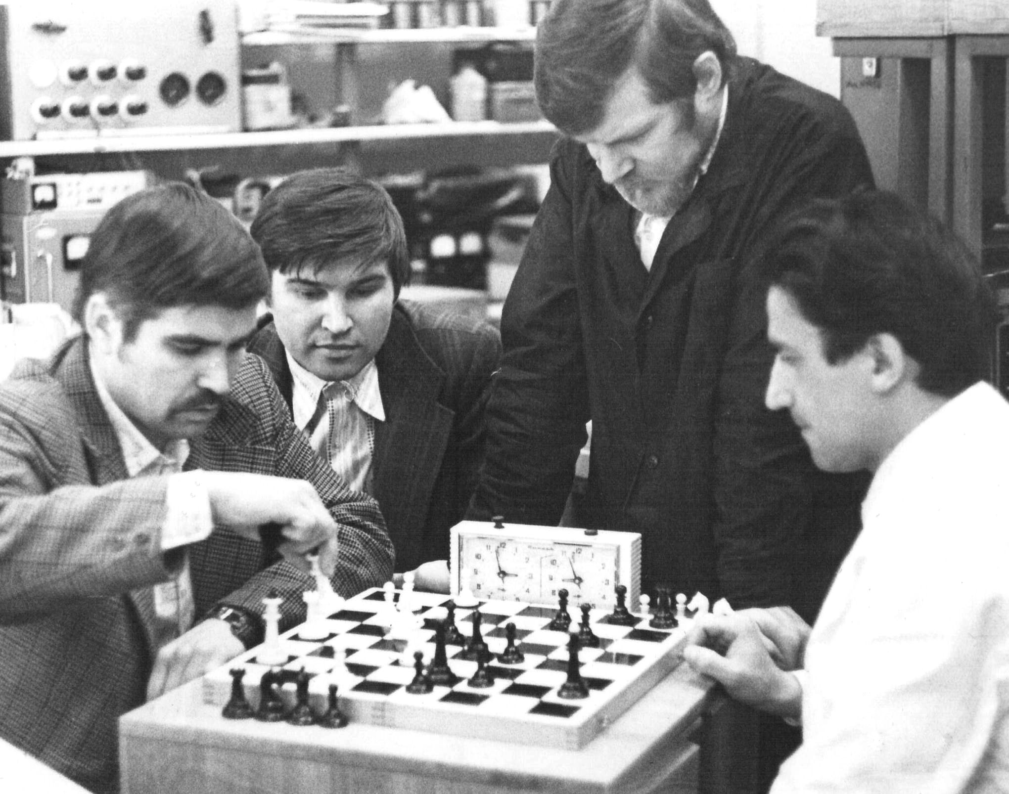Межлабораторный шахматный турнмр 1982 года в Институте физики им. Л.В. Киренского Сибирского отделения Академии наук СССР (ИФ СО АН СССР). Слева направо: Блохин В.Ф., Тюрнев В.В. , Беляев Б.А., Розанов. Красноярск.