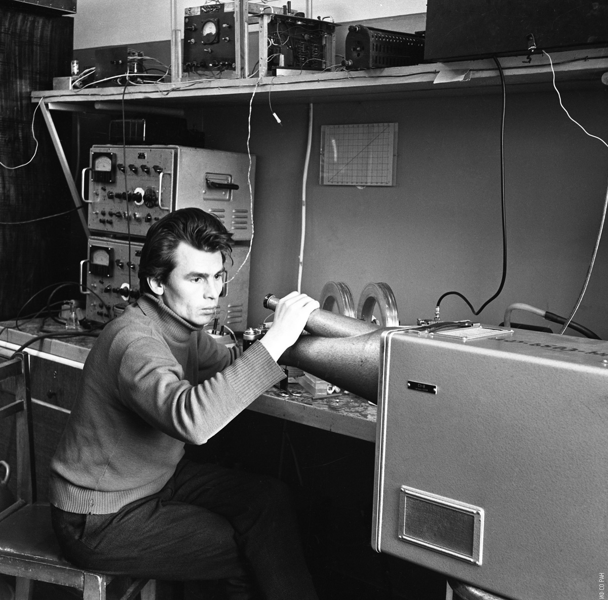 Уткин Юрий Владимирович, младший научный сотрудник в лаборатории высокочастотных и импульсных свойств тонких магнитных пленок Института физики им. Л.В. Киренского Сибирского отделения Академии наук СССР (ИФ СО АН СССР), проводит измерения на установке по импульсному перемагничиванию тонких магнитных пленок, фото 1972 года.