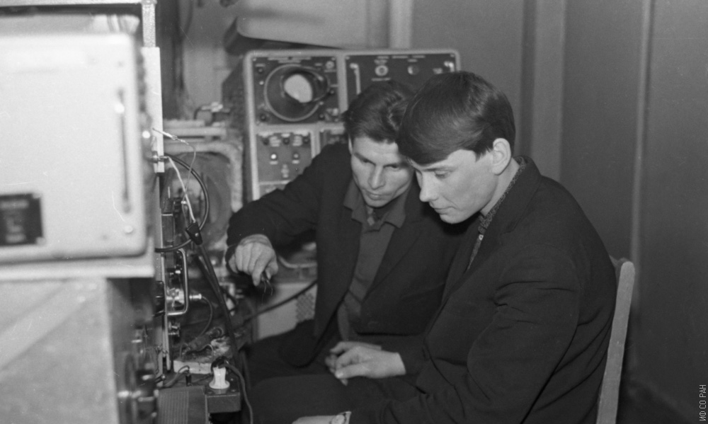 Инженер Уткин Ю.В. и лаборант Соколов А. проводят измерения на установке методом импульсного перемагничивании пленок в лаборатории высокочастотных и импульсных свойств тонких магнитных пленок Института физики Сибирского отделения Академии наук СССР (ИФ СО АН СССР), фото 1967 года. Красноярск.