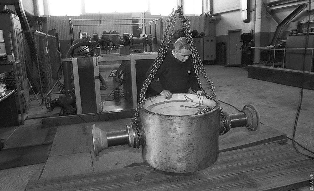 Вейсиг Г. С., ведущий инженер лаборатории сильных магнитных полей Института физики им. Л.В. Киренского Сибирского отделения Академии наук СССР (ИФ СО АН СССР), за сборкой соленоида на 200 кЭ, фото 1987 года. Красноярск.