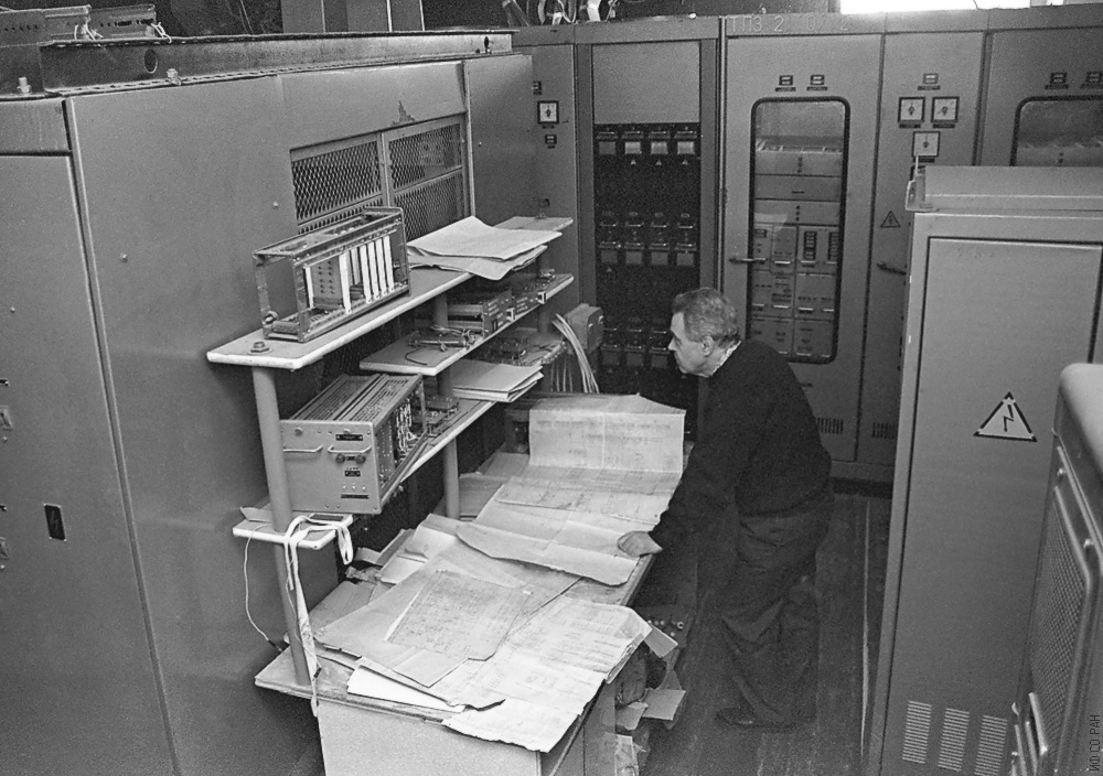 1993 год. Вейсиг Георгий Степанович у пульта управления энергопитания диссипативного водоохлаждаемого соленоида с расчетным магнитным полем 200 кЭ. Такой соленоид, с потреблением энергии в 9 мегаватт, был разработан, изготовлен и запущен в лаборатории сильных магнитных полей Института физики им. Л.В. Киренского Сибирского отделения Российской академии наук (ИФ СО РАН) в 1989 году. Красноярск.