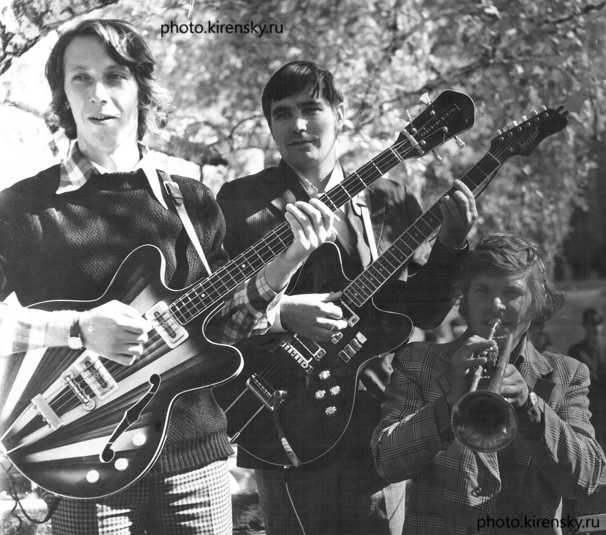 1977 год. Праздник Академгородка. Настроение участникам праздника создают музыканты вокально-инструментального ансамбля, созданного в Институте физики им. Л.В. Киренского Сибирского отделения Академии наук СССР под руководством Бориса Афанасьевича Беляева. На снимке, слева направо: Владимир Тинт, Александр Владимиров, и Борис Беляев. Красноярск.