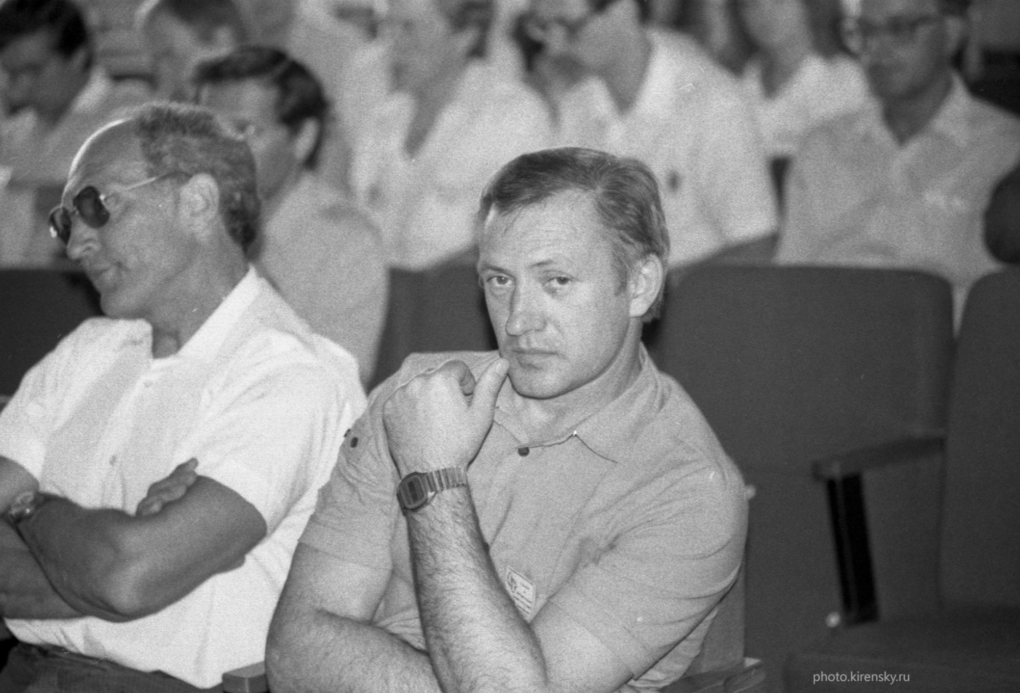 1986 год. Сотрудниками лаборатории резонансных свойств магнитоупорядоченных веществ Института физики им. Л.В. Киренского Сибирского отделения Академии наук СССР в городе Дивногорске (Красноярский край) была организована и проведена Всесоюзная конференция по аморфному магнетизму. На снимке участники конференции: в первом ряду слева направо: Петраковский Г.А., ? , Владимиров В.М. В следующем ряду Кононов В.П.