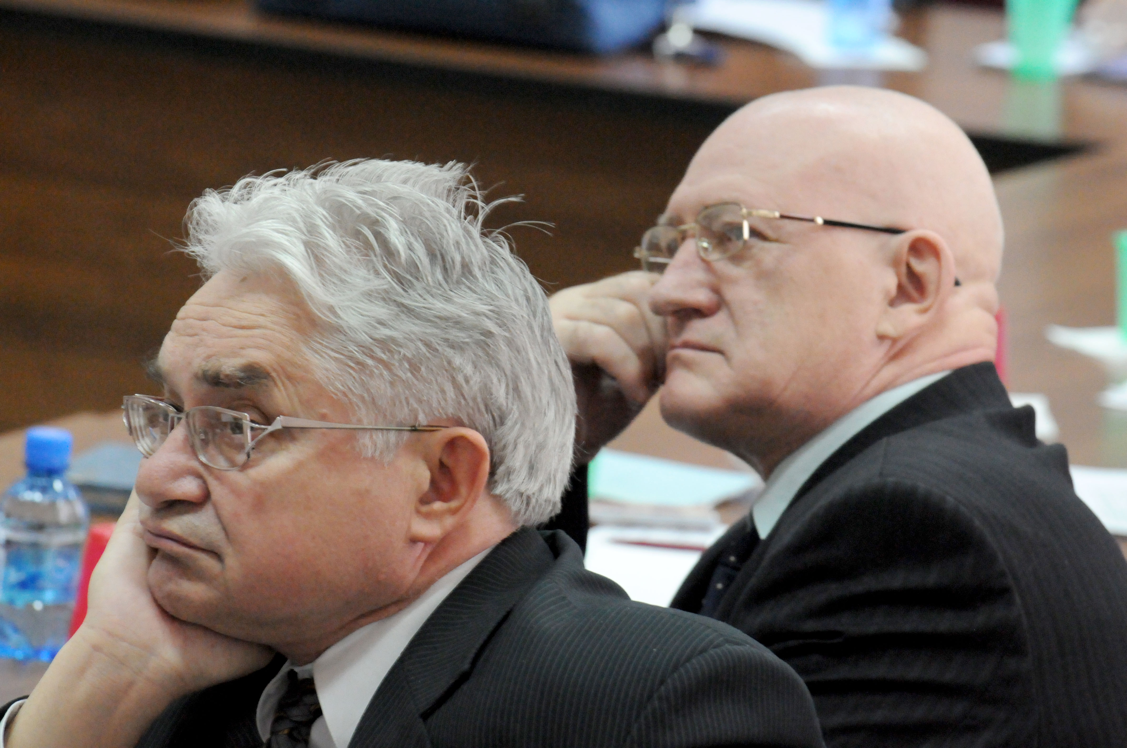 2008 год. Академик В.Ф. Шабанов, председатель Президиума Красноярского научного центра Сибирского отделения Российской академии наук (КНЦ СО РВН), директор Института физики им. Л.В. Киренского Сибирского отделения Российской академии наук (ИФ СО РАН) и В.М. Владимиров (справа), заместитель председателя Президиума Красноярского научного центра СО РАН по научно-техническим вопросам, в конференц-зале Института физики на заседании ученого Совета.