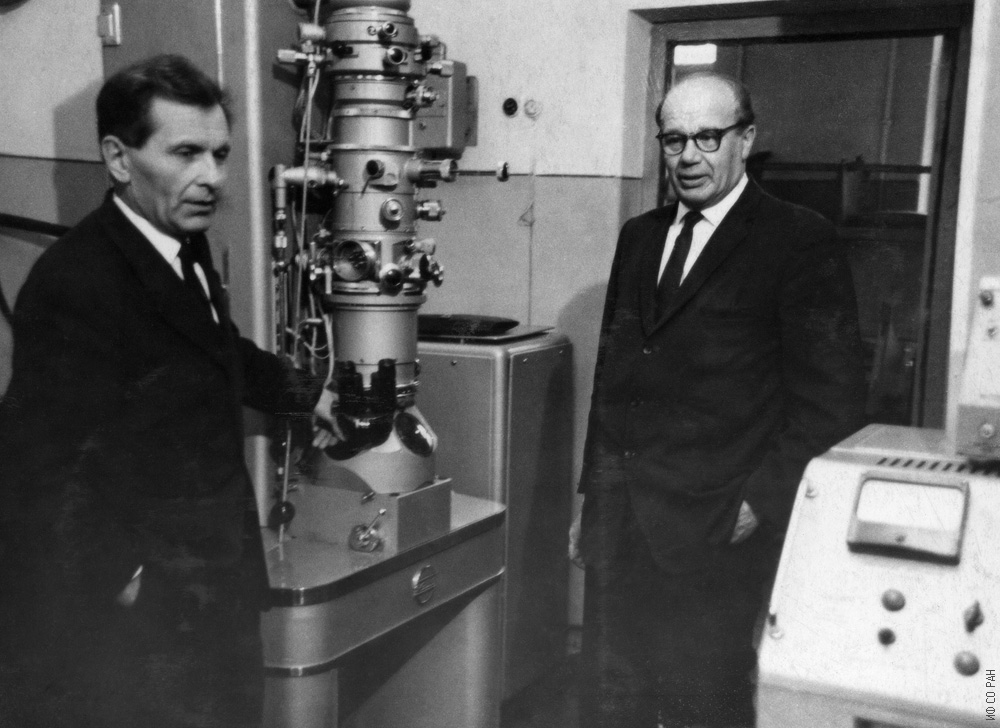 А.Я. Власов (слева) знакомит профессора Московского государственного университета Е.И. Кондорского с постановкой структурных исследований горных пород в лаборатории горных пород и геофизики Института физики Сибирского отделения Академии наук СССР. Красноярск. Фото 1967 года.