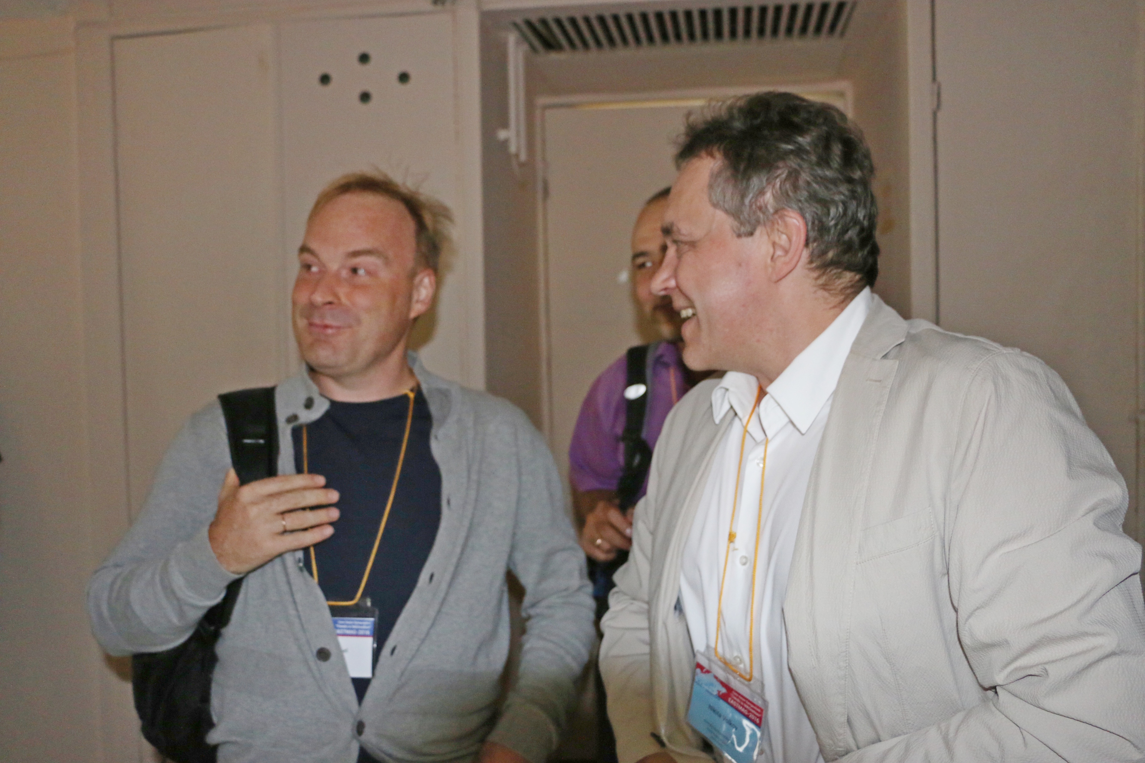 Член-корреспондент Российской академии наук (РАН) Мушников Н.В. (Институт физики металлов им. М.Н. Михеева Уральского отделения РАН (УрО РАН) (слева) с директором Института физики им. Л.В. Киренского Сибирского отделения Российской академии наук Волковым Н.В во время Евро-Азиатского симпозиума "Прогресс в магнетизме" (EASTMAG-2016) в Краснояррске.