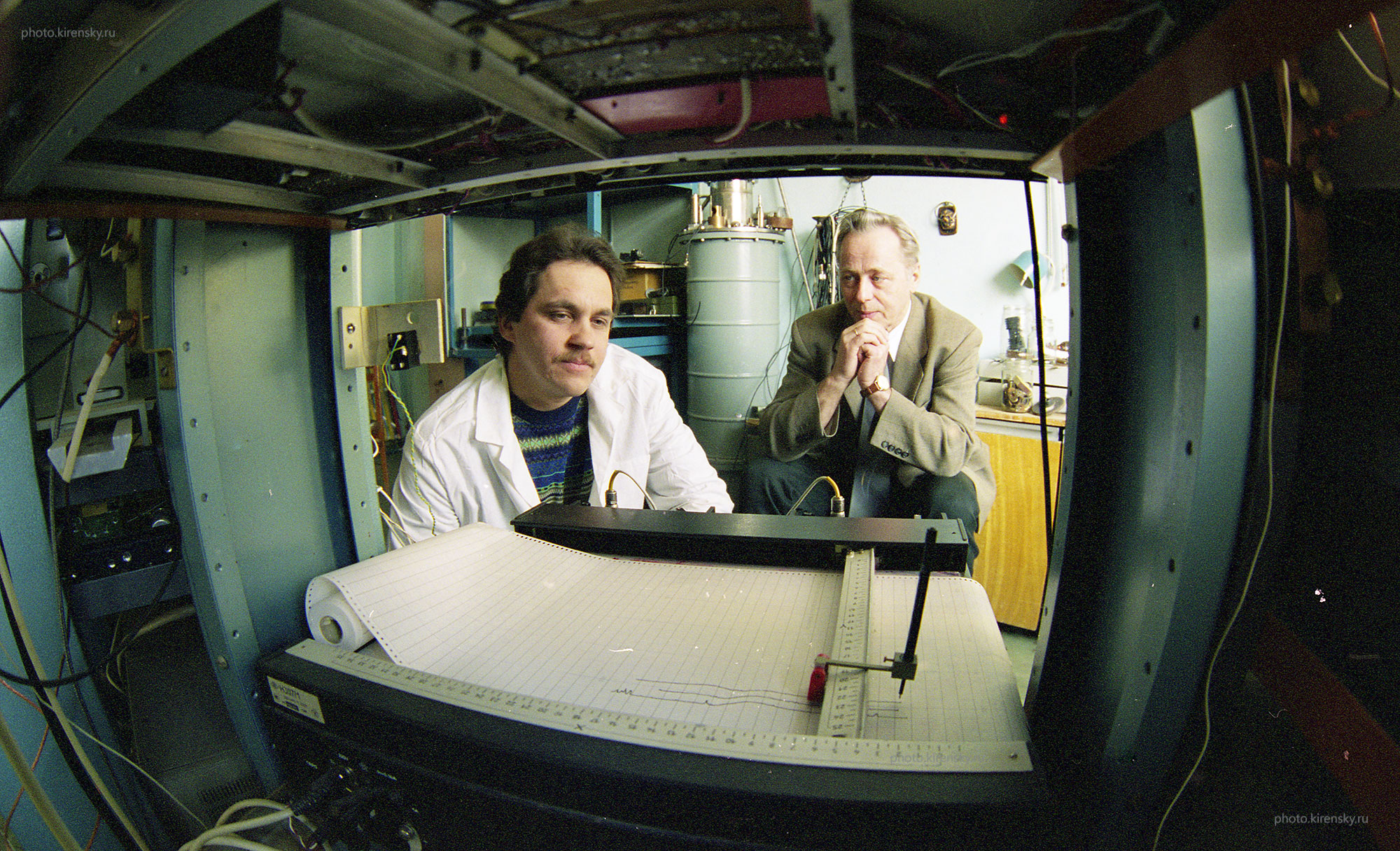 Волков Никита Валентинович, кандидат физико-математических наук, старший научный сотрудник и Петраковский Герман Антонович, доктор физико-математических наук, профессор, заведующий лабораторией резонансных свойств магнитоупорядоченных веществ, за лабораторной установкой. Снимок 1996 года.