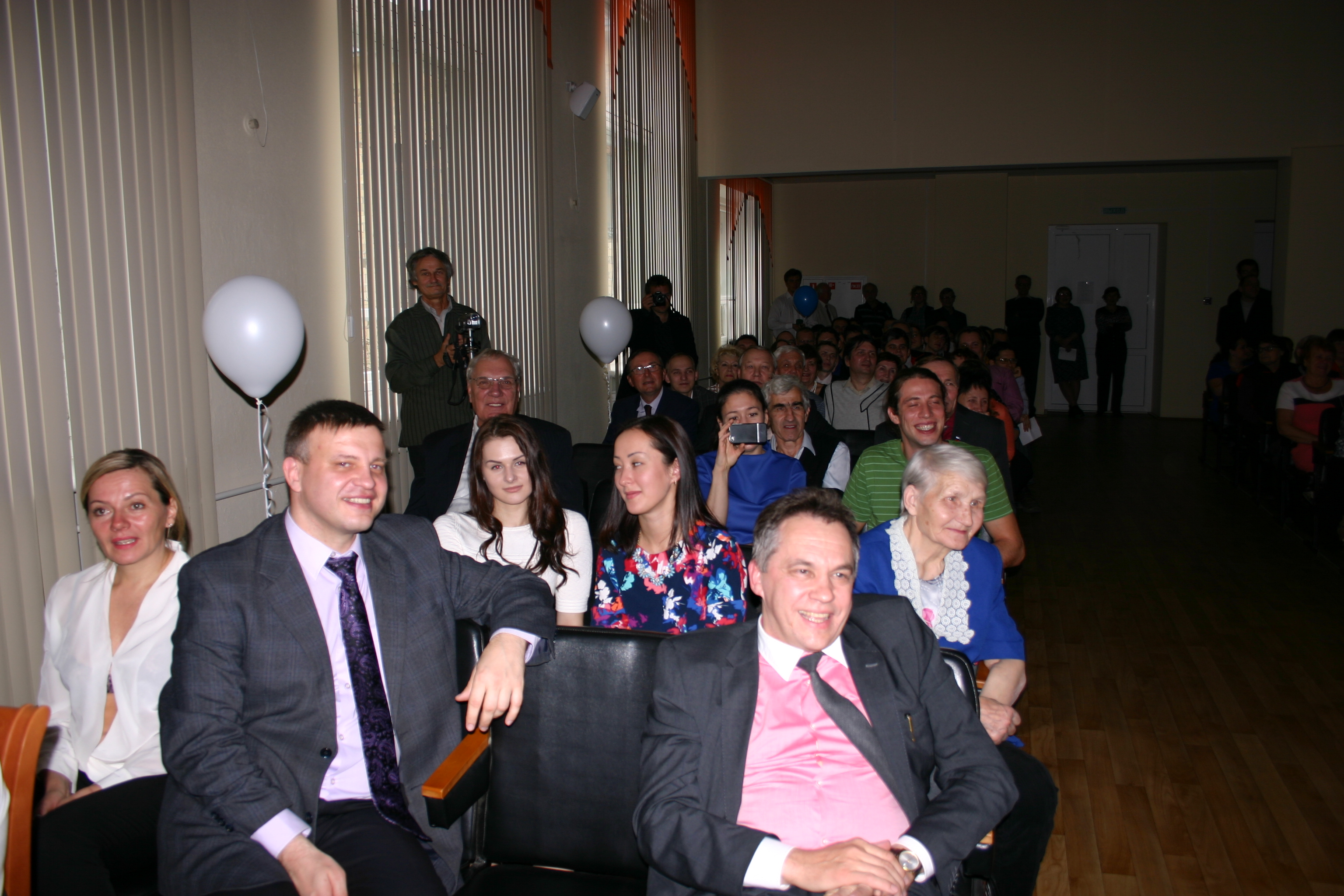 12 октября 2016 года. На празднике в честь 60-летия Института физики им. Л.В. Киренского Сибирского отделения Российской академии наук (ИФ СО РАН). Конференц-зал. Идет художественная самодеятельность, подготовленная сотрудниками института. В первом ряду Ф.Н. Томилин (слева) и Н.В. Волков, директор ИФ СО РАН. Красноярск.