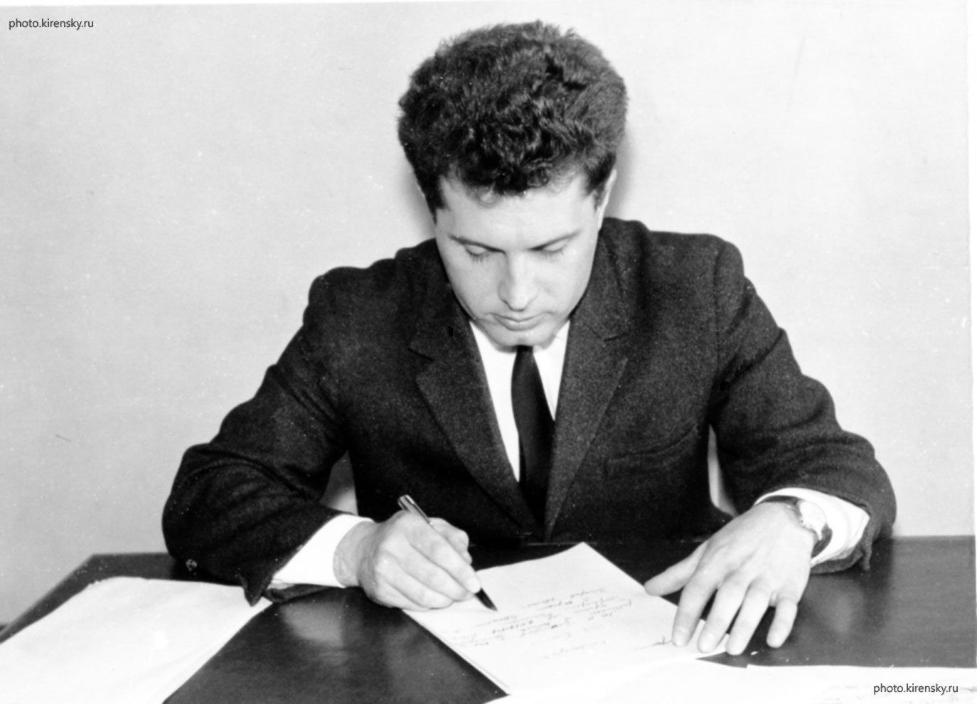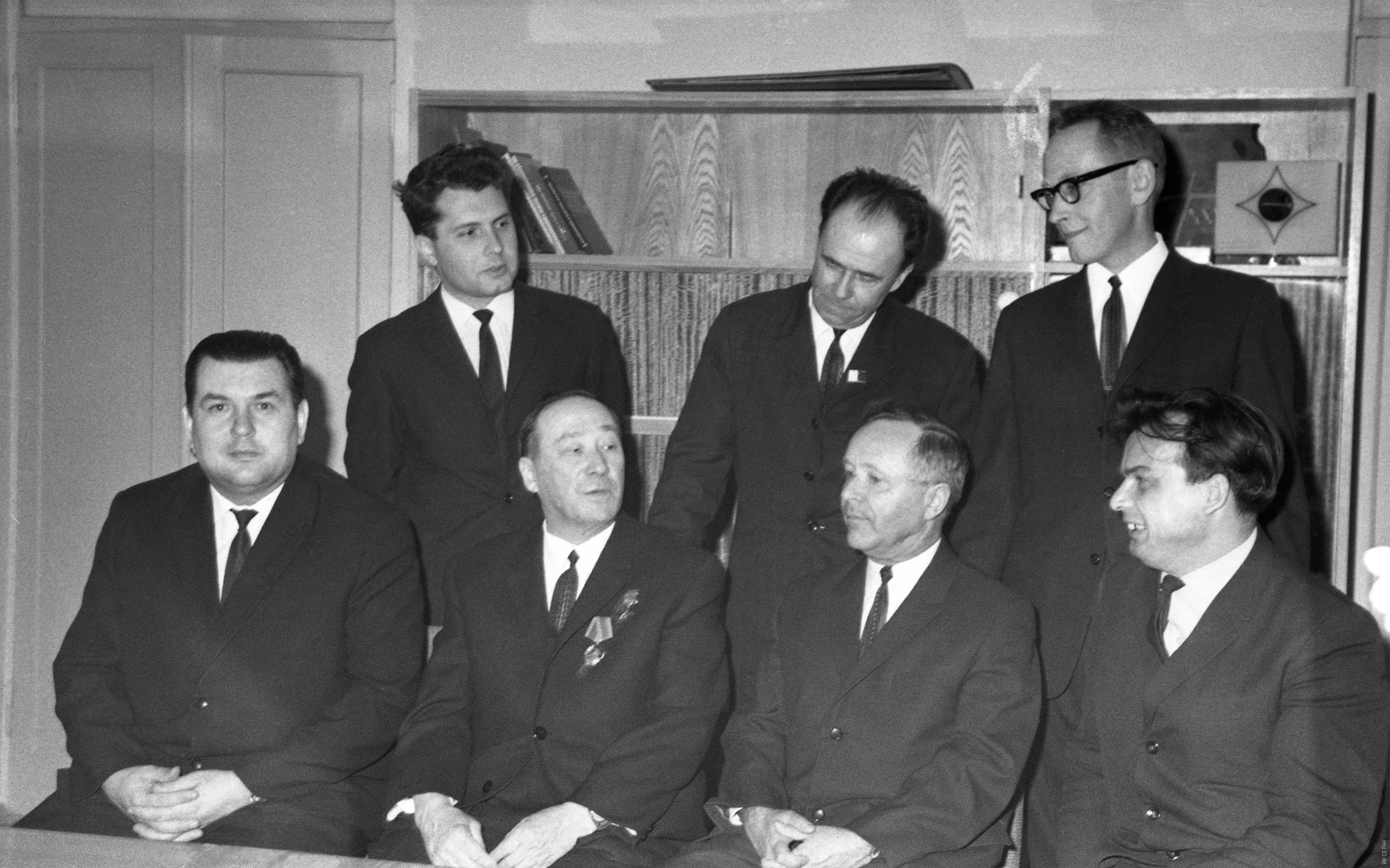 В марте 1969 года академику Леониду Васильевичу Киренскому, директору организованного им Института физики Сибирского отделения Академии наук СССР, было присвоено звание Героя Социалистического Труда с вручением Ордена Ленина и золотой медали «Серп и молот». Фото на память. Сидят, слева направо: Н. Ф. Татарчук - председатель Красноярского краевого исполнительного комитета; Л.В. Киренский, Л.Г. Сизов, председатель исполкома Красноярского горсовета; В. В. Калинин, заведующий отделом науки Красноярского краевого комитета КПСС. Стоят, слева направо: Ю. В. Захаров, ученый секретарь Института физики; Р. Г. Аннаев – академик Туркменской АН СССР, друг Киренского; К. С. Александров, заместитель директора по научной работе Института физики. Красноярск.