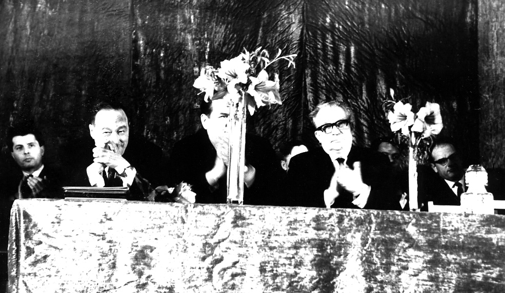 7 апреля 1969 года юбилей академика Л.В. Киренского, организатора и первого директора Института физики Сибирского отделения Академии наук СССР (ИФ СО АН СССР). Ему исполнилось 60 лет. В конференц-зале Института физики состоялось чествование юбиляра. Слева направо: Ю.В. Захаров, Л.В. Киренский и гости юбиляра. Красноярск.