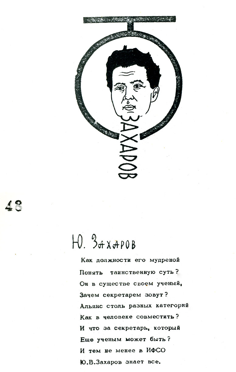 Дужеский шарж Захарова Ю.В. из книги "Музей друзей", изданной научными сотрудниками института Олегом Артемьевичем Баюковым и Николаем Сергеевичем Чистяковым. Удивительная книжка дружеских шаржей и эпиграмм на сотрудников Института физики Сибирского отделения Академии наук СССР. Она вышла в 1967 году к 10-летию начала работы института. Вышла небольшим тиражом в 100 экземпляров и распространялась строго по списку, лично в руки. Узнать себя на страницах книги смогли 48 самых ярких и заметных личностей молодого института. Позже (в 1971 году) вышла вторая книга под таким же названием. Что побудило их взяться за такой труд, авторы подробно изложили в предисловии к первой и второй книгам. Книги размещены на сайте.