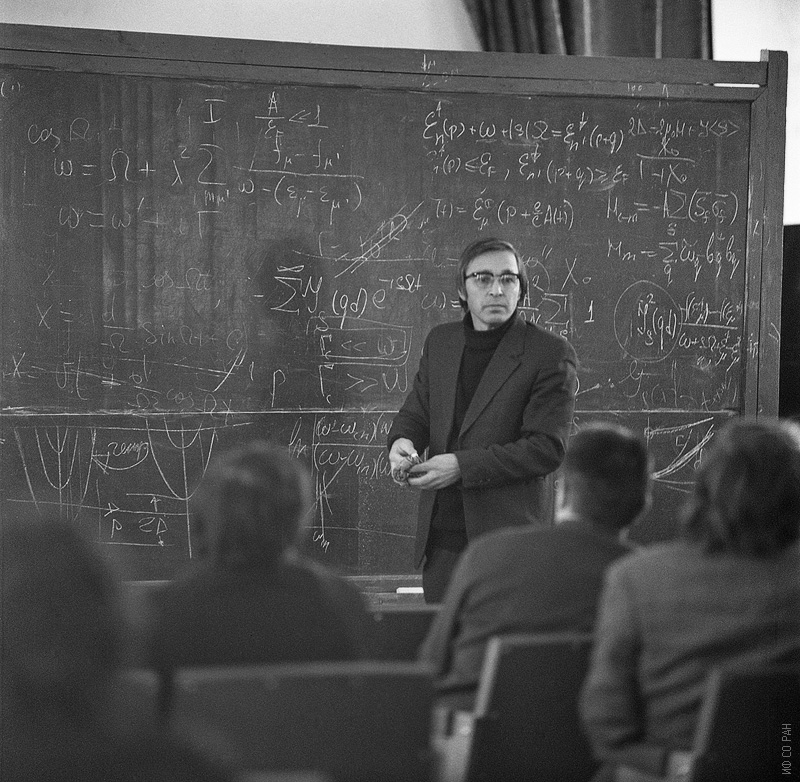 1980 год. Заславский Георгий Моисеевич, заведующий лабораторией нелинейных процессов Института физики им. Л.В. Киренского Сибирского отделения Академии наук СССР (ИФ СО АН СССР), выступает на семинаре теоретического отдела института. Красноярск.