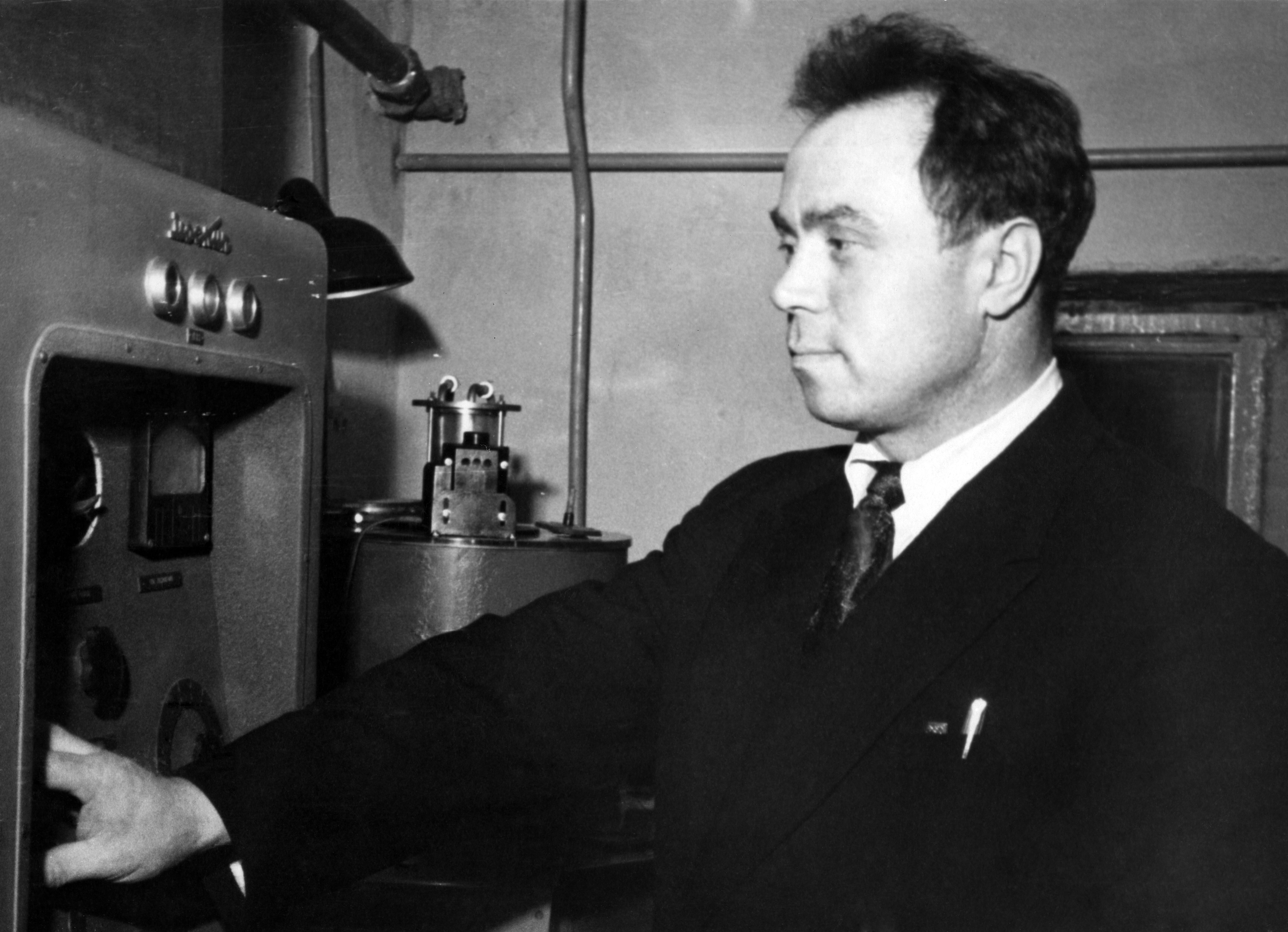 Зырянов Гаврила Иванович, старший инженер лаборатории магнитных материалов Института физики Сибирского отделения Академии наук СССР (ИФ СО АН СССР), специалист в области технологий для изготовления поли- и монокристаллических ферритов, за одной из установок для выращивания монокристаллических ферритов, фото 1962 года.