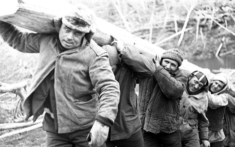Охотничьи угодья Института физики Сибирского отделения Академии наук СССР (ИФ СО АН СССР) в зоне затопления Красноярского моря. Рыбаки и охотники института обустраивают жизнь. Первым в цепочке Зырянов Г.И., фото 1963 года.