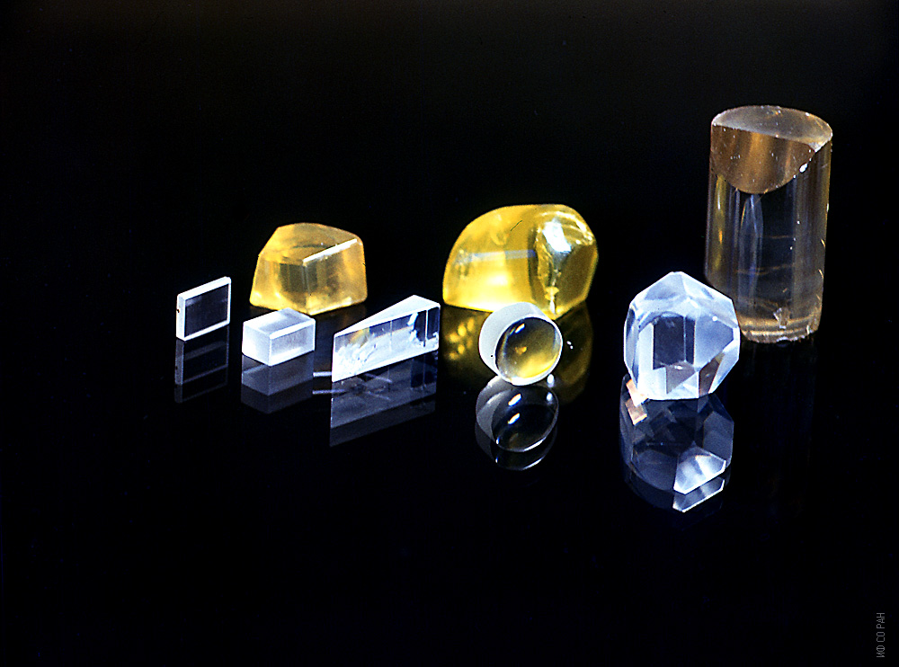 На снимке: кристаллы хлористого свинца, хлористого цезия-свинца, которые были выращены в лаборатории кристаллофизики Института физики им. Л.В. Киренского Сибирского отделения АН СССР (руководитель лаборатории Александров К.С.) методом Бриджмена. Кристаллы прозрачны в широком спектральном диапазоне с высокой акустооптической эффективностью. Снимок 1980 года. Красноярск.