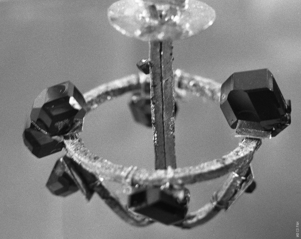 Монокристаллы железо-иттриевого граната, выращенные на "точечных" затравках разных форм в лаборатории магнитных материалов, 2000 г.