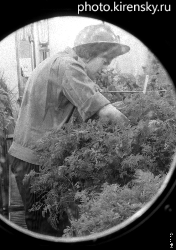 Шиленко М.П., участник эксперимента на установке «БИОС-3», проведенного отделом биофизики Института физики им. Л.В. Киренского Сибирского отделения Академии наук СССР (ИФ СО АН СССР) в 1973 году. На фото - сбор овощей для обеденного салата на «огороде» «БИОС-3».