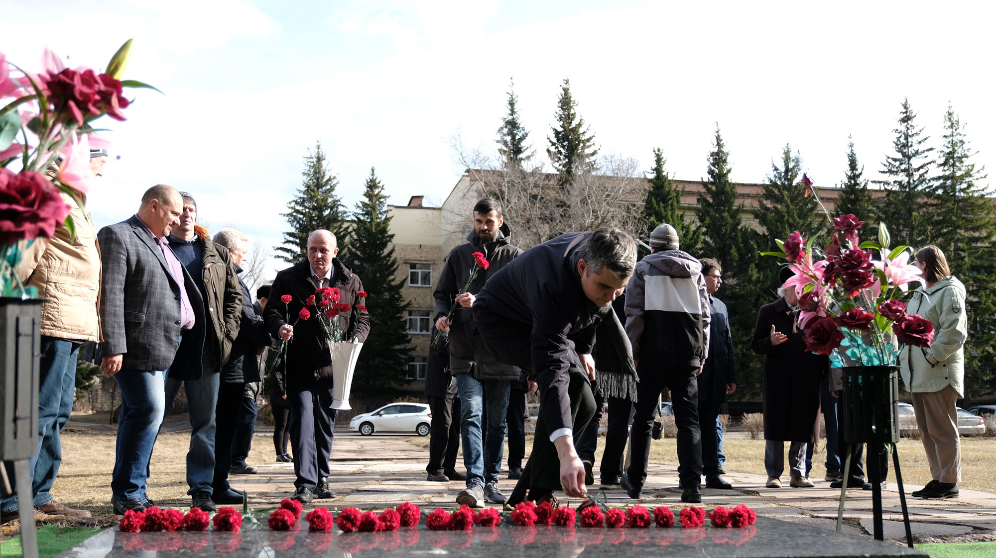 Ежегодно в день рождения академика Л. В. Киренского, организатора и первого директора Института физики Сибирского отделения Российской академии наук (ИФ СО РАН), носящего его имя, проводятся научные чтения на расширенном заседание ученого Совета института, посвященного памяти Леонида Васильевича. Он похоронен на территории организованного им института в Академгородке Красноярска. На снимке, слева направо: А.Э. Соколов, заместитель директора по научной работе; С.М. Жарков, ведущий научный сотрудник лаборатории когерентная оптика; Д.А. Балаев, директор Института физики, А.С. Тарасов, заведующий лабораторией радиоскопии и спиновой электроники; М.М. Коршунов (в очках), член-корреспондент РАН, главный научный сотрудник лаборатории физики магнитных явлений. Возлагает цветы – ученый секретарь ИФ А.О. Злотников. 7 апреля 2025 года