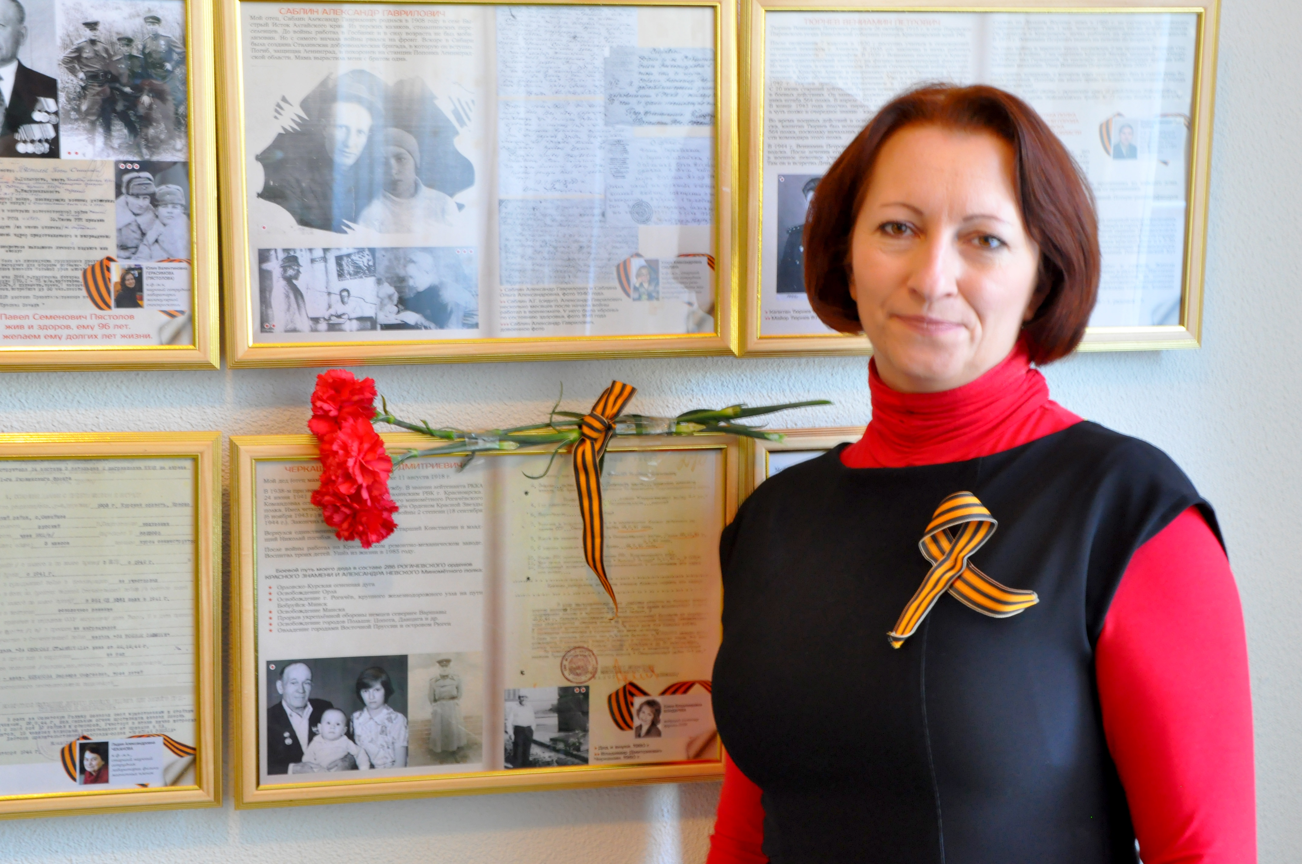 2015 год, 8 мая. Бондарева Е.В. у стенда «Живем и помним…», организованного в Институте физики им. Л.В. Киренского Сибирского отделения РАН к 70- тию Победы в Отечественной войне 1941-1945 гг. На стенде материал о ее дедушке Владимире Дмитриевиче Черкашине. Красноярск.
